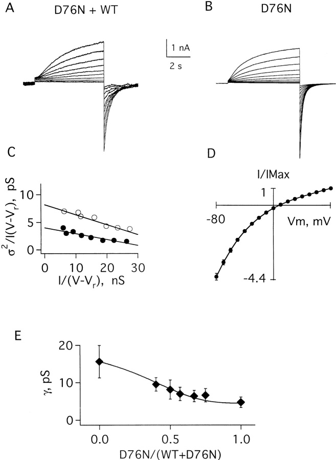Figure 6. Current–variance relationships of IKs channels formed with wild-type and D76N minK subunits. (A) Family of currents recorded in a patch excised from an oocyte coinjected with KvLQT1 cRNA and a 1:1 mixture of wild-type and D76N minK cRNAs. The patch was clamped at −60 mV and depolarized from −20 to 70 mV in 10-mV steps. (B) Family of currents recorded from oocytes coinjected only with KvLQT1 and D76N minK cRNAs. The protocol was similar to A, except that test pulses were up to 80 mV. (C) Current–variance relationships computed from the patches in A (○) and B (•); the conductances calculated in these patches were 8.2 and 4.0 pS, respectively. (D) Current–voltage relationship of peak tail currents measured for D76N IKs channels, mean ± SEM for four patches. (E) Dependence of unitary conductance on the fraction of injected wild-type and D76N cRNAs. The theoretical line was constructed according to Eqs. 4–6 with a best fit yielding a maximal value of n = 2.8 minK subunits per channel (see discussion).