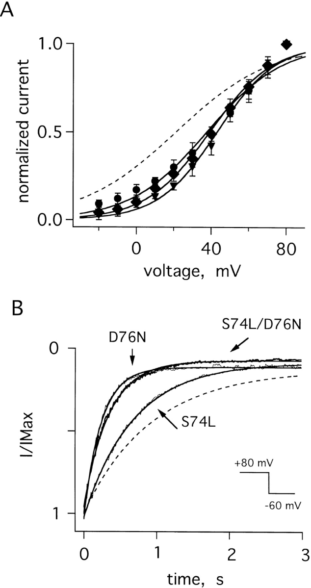 Figure 9. Gating attributes of mutant IKs channels. (A) Normalized open probabilities (I/IMax) for cells with D76N IKs channels (•, z = 1.3 ± 0.2), S74L IKs channels (▾, z = 1.6 ± 0.1), and S74L-D76N IKs channels (♦, z = 1.3 ± 0.2); protocols, theoretical fits, and equivalent valences (z) as in Fig. 5; the dotted line is the curve for wild-type IKs channels from Fig. 5 A. (B) Normalized tail currents at −60 mV for D76N, S74L, and D76N-S74L IKs channels; the dotted line is the curve for wild-type IKs channels from Fig. 5 B. Currents were elicited after a 6-s test pulse to 80 mV. Theoretical lines were constructed as described in the legend to Table I.