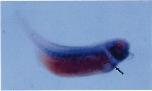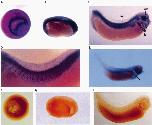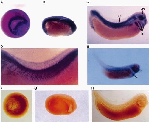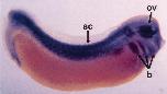Fig. 3. The spatial pattern of xC/EBPb expression during embryogenesis. Whole-mount in situ hybridisation to digoxigenin-labelled antisense (A) and sense probes (F), derived from the N-terminal region of the xC/EBPb gene, was carried out as described in Section 3. (A) mid-gastrulaembryo (stage 11) showing expression around the blastopore lip and in endodermal cells; (B) stage 22 embryo indicating expression in the fore brain and along the whole dorsal side; (C) stage 30 embryo indicating expression in the optic vesicle (ov), branchial arches (b), spinal cord (sc) and somites; (D) close view of a stage 30 embryo showing expression in the somites and the spinal cord; (E) stage 38 embryo, arrow indicates expression in the region that gives rise to the liver and heart; (F) representative control embryos probed with the sense probe, stages 11 (F), 22 (G) and 30 (I).