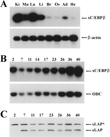 Fig. 2. Expression pattern of the xC/EBPβ gene. cDNA template was prepared against total RNA from either adult Xenopus kidney (Ki), muscle (Mu), lung (Lu), liver (Li), brain (Br), ovary (Ov), adipose tissue (Ad) and heart (He) (A) or from the following embryonic stages: 2 (cleavage), 7 (blastula), 11 (mid-gastrula), 14 (early neurula), 17 (mid-neurula), 23 (early tailbud), 26 (mid-tailbud), 36 (late tailbud) and 40 (early tadpole) (B). The cDNA was then used for PCR reactions in which primers against either the xC/EBPβ gene or the constitutively expressed β-actin or ODC gene (A and B, respectively) was present. The amplification products were subjected to Southern blot analysis, and their position is indicated by labelled arrows. (C). Western blot analysis was carried out on whole cell extracts from the embryonic stages indicated as described in Section 3. The blotted membranes were probed with rabbit antiserum to rat C/EBPβ ( Poli et al., 1990; Ramji et al., 1993), and the antigenâantibody complexes were detected using the ECL detection system. The positions of the xLAP* and xLAP polypeptides, produced by alternate use of translation initiation codons, are indicated by labelled arrows. The description of changes in band intensity included in the text are based on the replicated outcome of laser densitometric quantification.