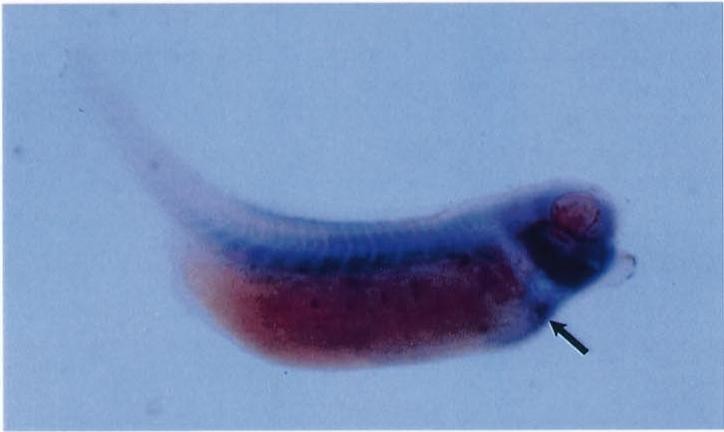 cebpb (CCAAT/enhancer binding protein beta) gene expression in Xenopus laevis embryo, assayed via in situ hybridization, NF stage 22, lateral view, anteriorright, dorsal up.