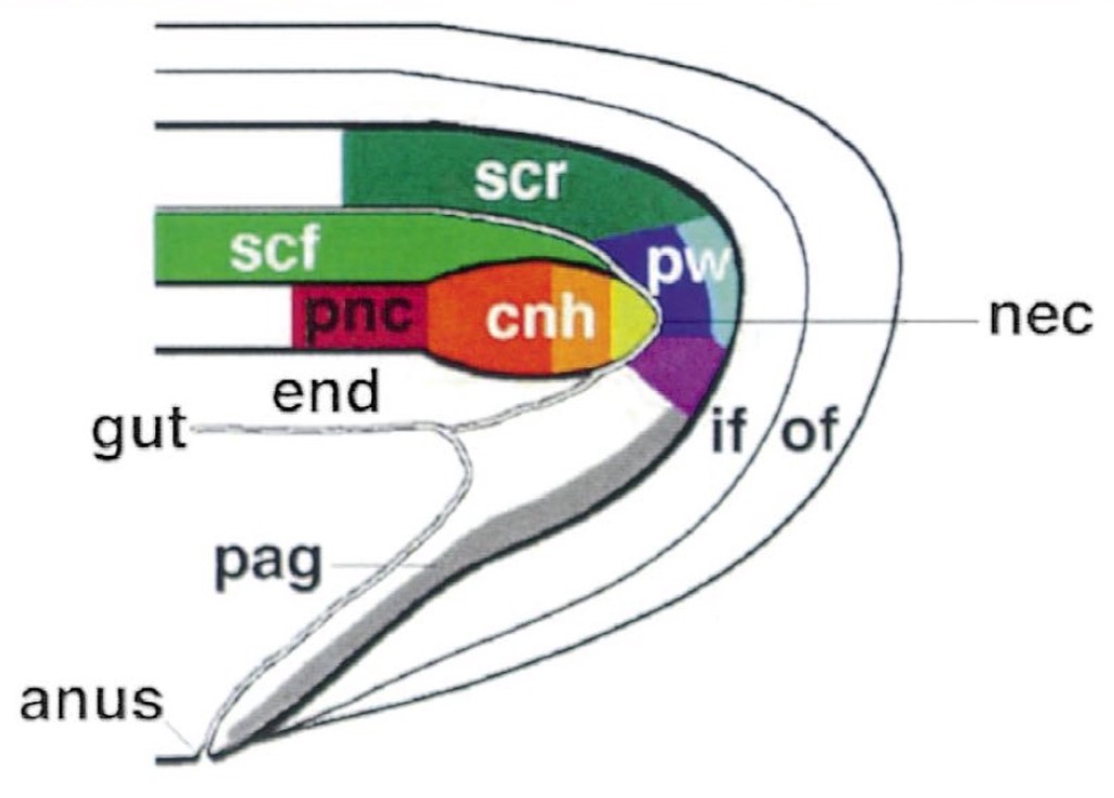 Diagram summarizing the identified domains of the tail region, in mid-sagittal section. cnh, chordoneural hinge (orange to yellow); end, endoderm; if, inner fin; mcnh, of, outer fin; nec, neurenteric canal; pag, post-anal gut; pnc, posterior notochord (red); pw, posterior wall ( dark blue and light blue); scf, spinal cord, floor plate (light green); and scr, spinal cord, roof plate ( dark green). |