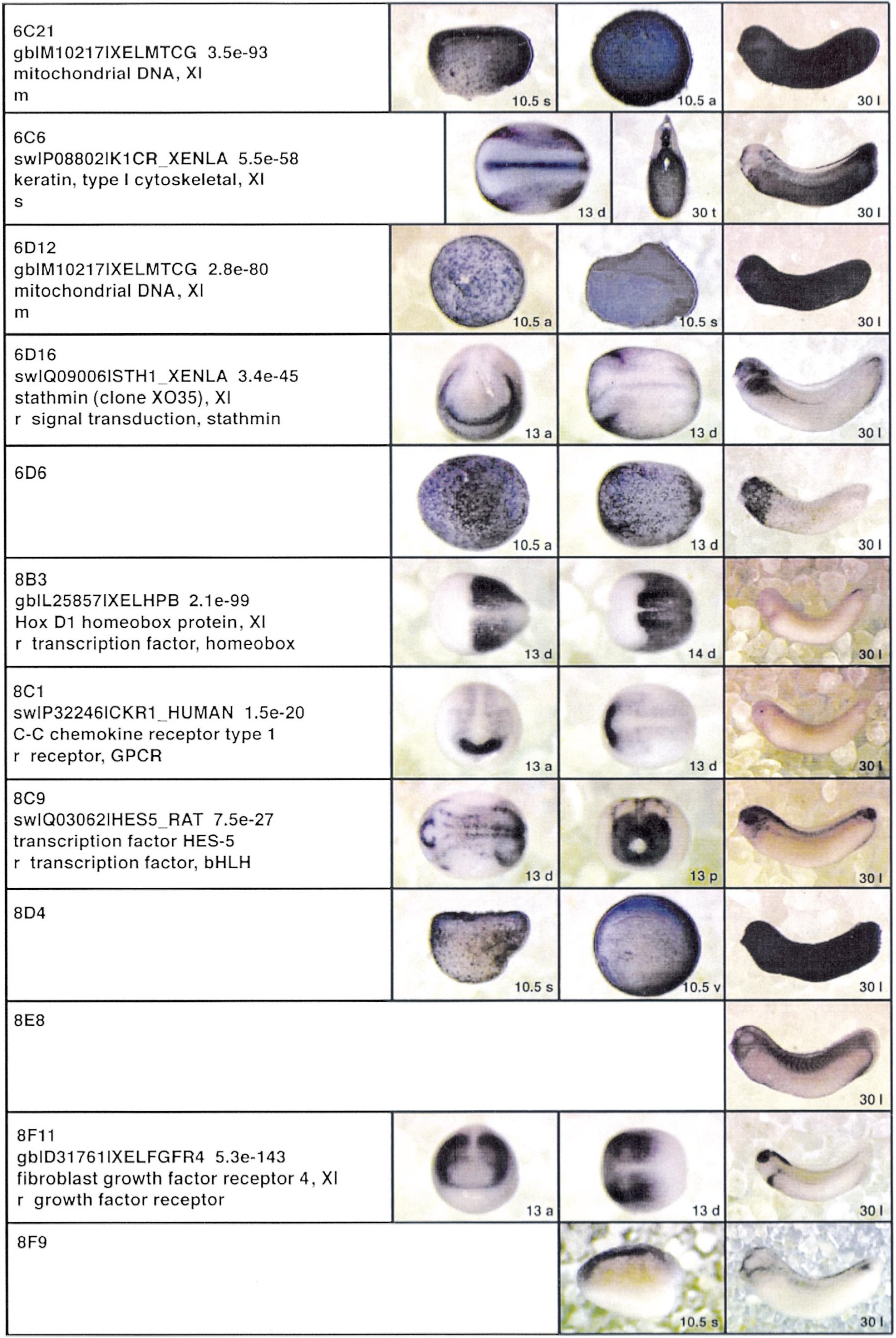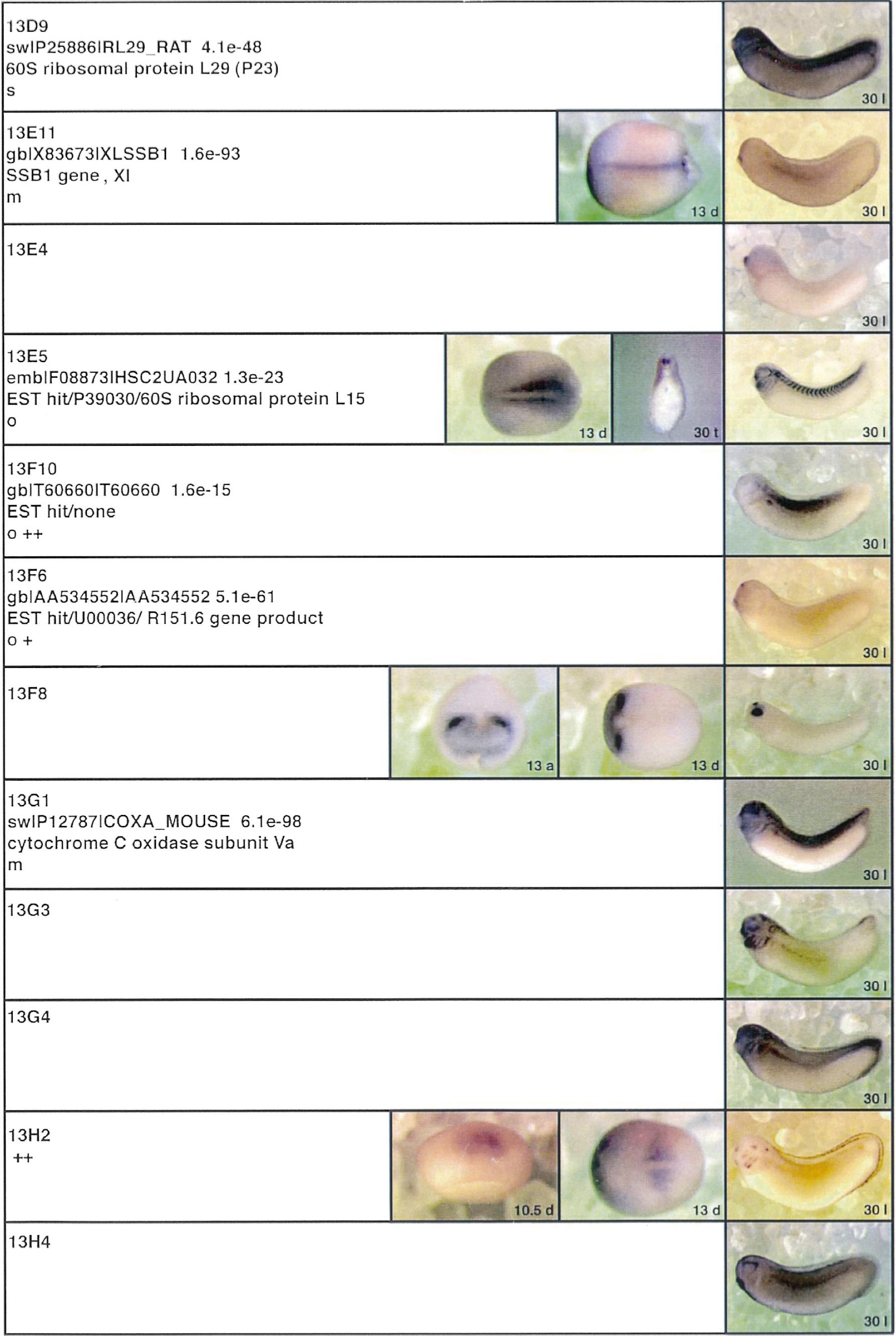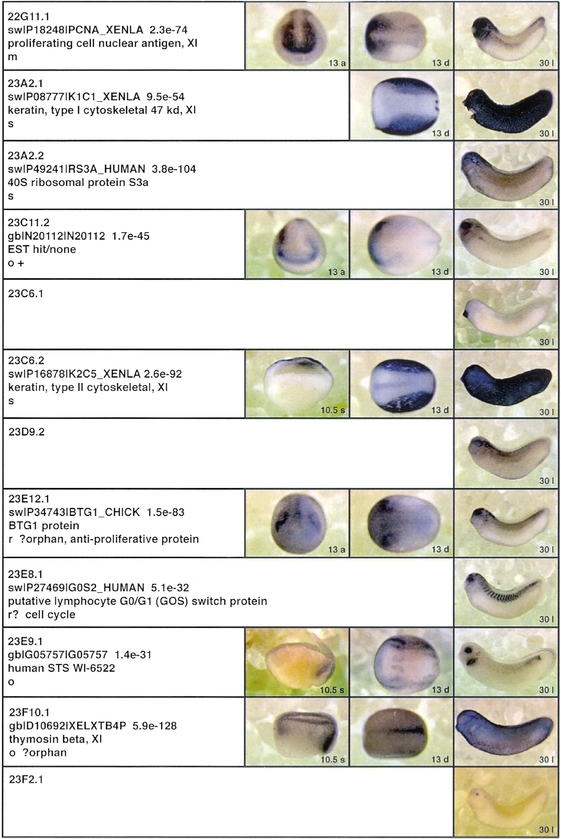 Fig. 3. Whole mount in situ hybridizations, sequence similarities and functional classifications. The left-most part represents the results of sequence similarity searches from 273 partially sequenced cDNAs representing unique, differentially expressed genes: clone name; accession number of best hit, P-value; name of best hit; functional classification. The order of the genes follows first digit sorting, e.g. 1, 10, 2, 20 etc. Abbreviations: o, orphan genes; m, metabolism gene; r, developmental regulator gene; r?, housekeeping regulator gene; s, structural gene; Xl, known Xenopus gene; +, GRAIL1 good coding potential; ++, GRAIL1 excellent coding potential. The P-value is the probability provided by the BLAST programme and calculated using Karlinltschul statistics, that the sequence similarity is due to randomness. For EST hits, the similarities derived from the comparison of the EST or cluster of EST sequences is given. The right-most part shows in situ hybridizations results for stages 10+, 13 and 30. Abbreviations are: a, animal view (stage 10); a, anterior view (stage 30); d, dorsal view; l, lateral view; p, posterior view; s, sagittal section; t, transverse section; v, vegetal view (stage 10); v, ventral view (stage 30). page 12 |