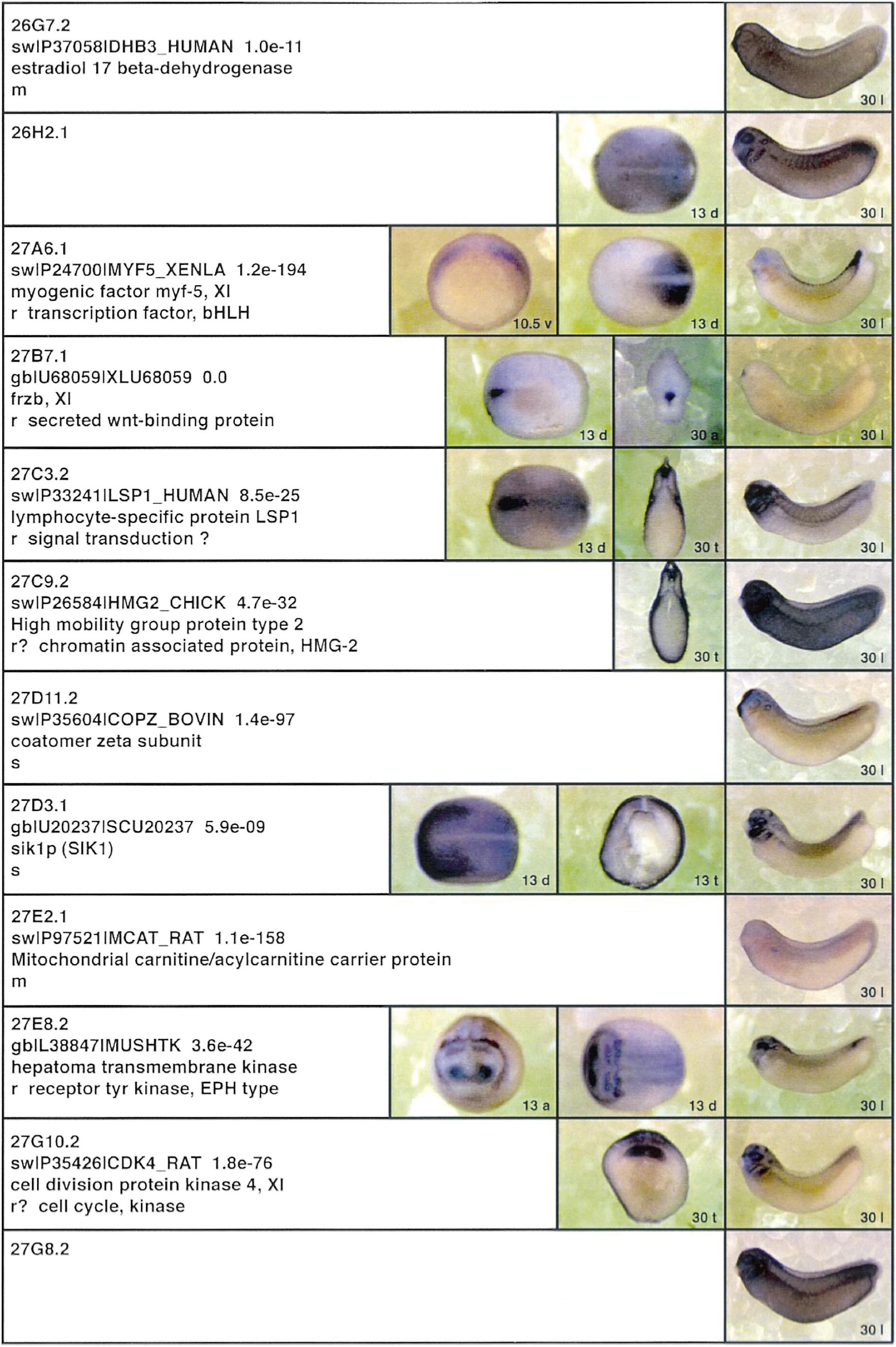 Fig. 3. Whole mount in situ hybridizations, sequence similarities and functional classifications. The left-most part represents the results of sequence similarity searches from 273 partially sequenced cDNAs representing unique, differentially expressed genes: clone name; accession number of best hit, P-value; name of best hit; functional classification. The order of the genes follows first digit sorting, e.g. 1, 10, 2, 20 etc. Abbreviations: o, orphan genes; m, metabolism gene; r, developmental regulator gene; r?, housekeeping regulator gene; s, structural gene; Xl, known Xenopus gene; +, GRAIL1 good coding potential; ++, GRAIL1 excellent coding potential. The P-value is the probability provided by the BLAST programme and calculated using Karlinltschul statistics, that the sequence similarity is due to randomness. For EST hits, the similarities derived from the comparison of the EST or cluster of EST sequences is given. The right-most part shows in situ hybridizations results for stages 10+, 13 and 30. Abbreviations are: a, animal view (stage 10); a, anterior view (stage 30); d, dorsal view; l, lateral view; p, posterior view; s, sagittal section; t, transverse section; v, vegetal view (stage 10); v, ventral view (stage 30). page 13 |