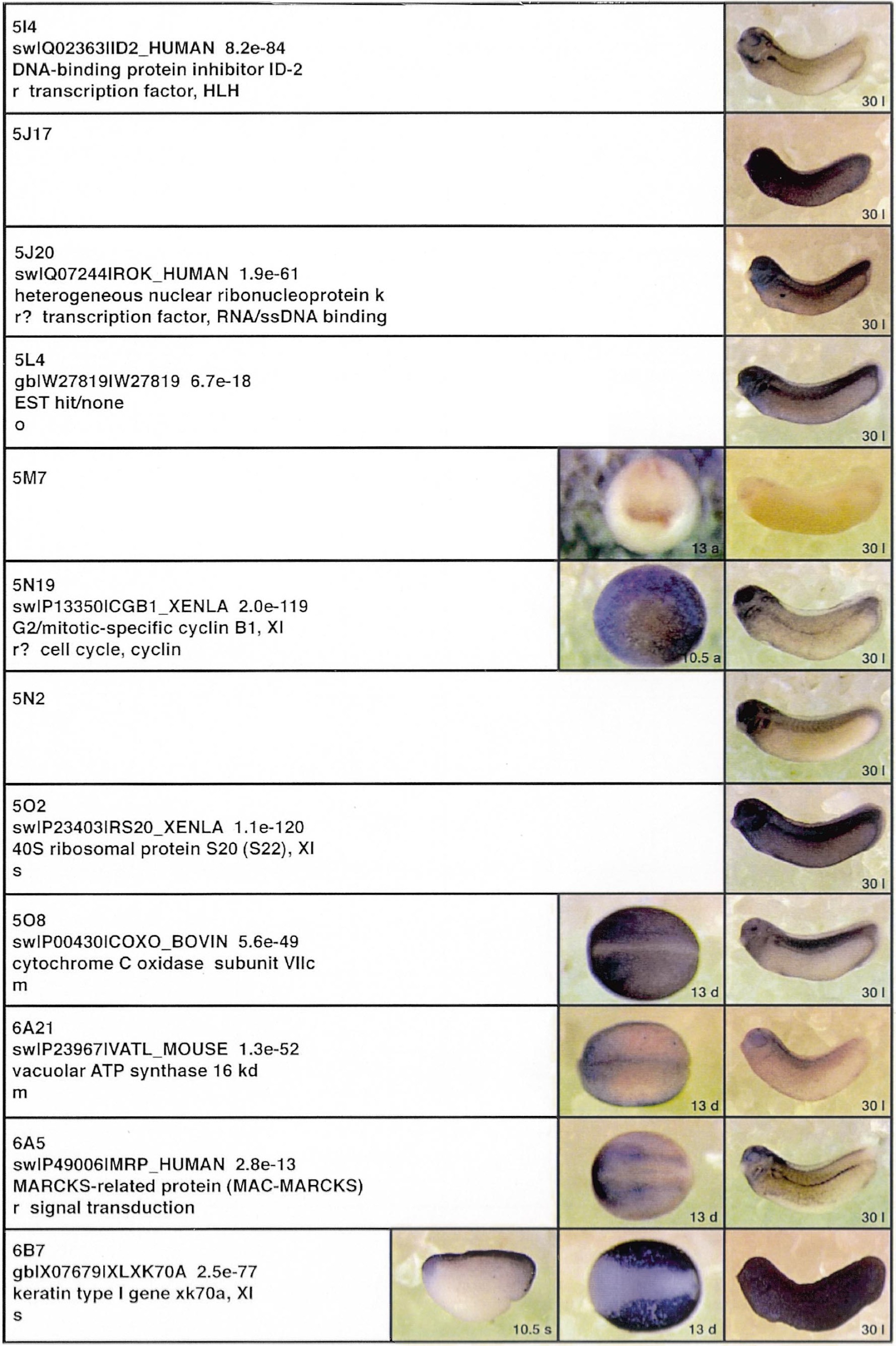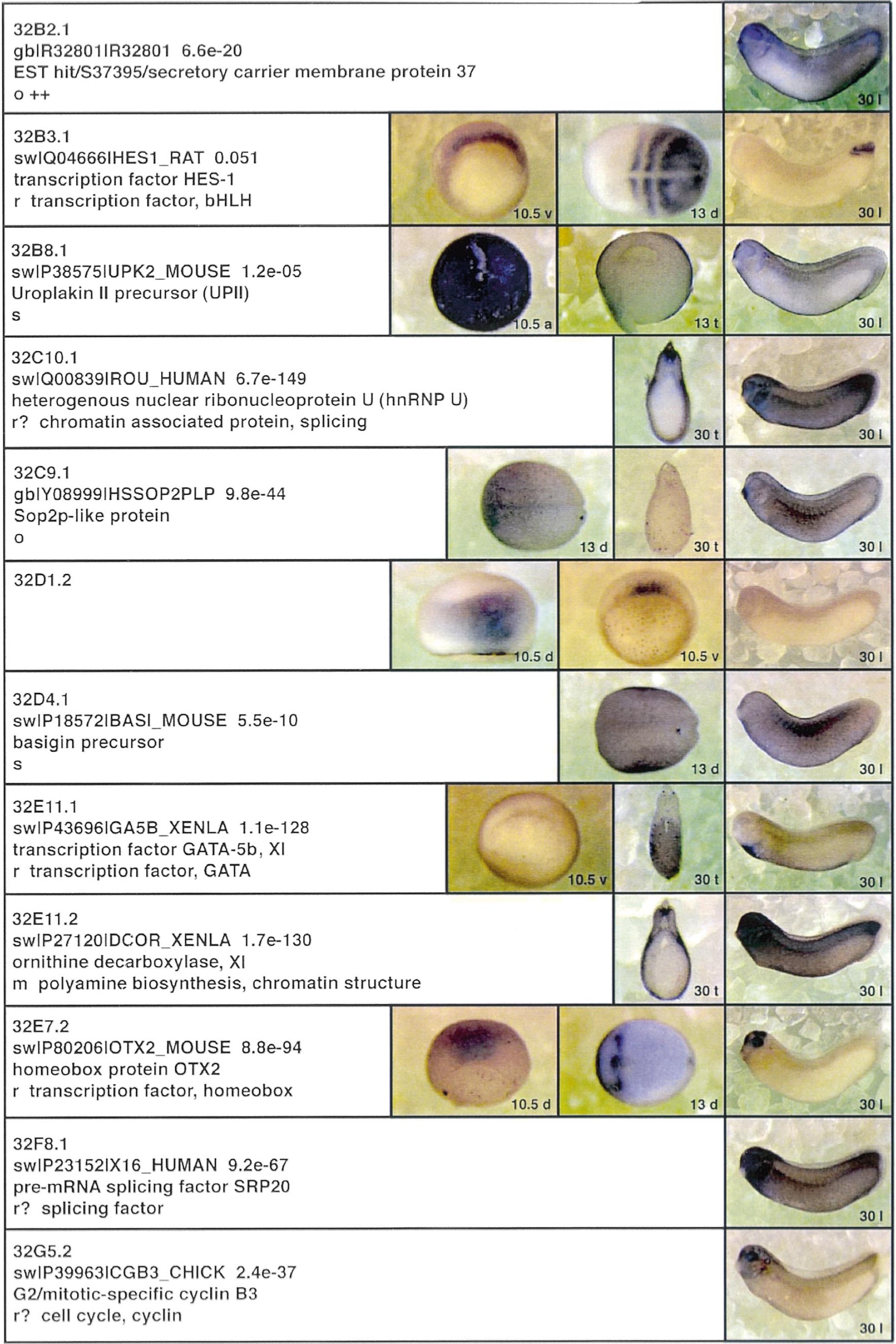 Fig. 3. Whole mount in situ hybridizations, sequence similarities and functional classifications. The left-most part represents the results of sequence similarity searches from 273 partially sequenced cDNAs representing unique, differentially expressed genes: clone name; accession number of best hit, P-value; name of best hit; functional classification. The order of the genes follows first digit sorting, e.g. 1, 10, 2, 20 etc. Abbreviations: o, orphan genes; m, metabolism gene; r, developmental regulator gene; r?, housekeeping regulator gene; s, structural gene; Xl, known Xenopus gene; +, GRAIL1 good coding potential; ++, GRAIL1 excellent coding potential. The P-value is the probability provided by the BLAST programme and calculated using Karlinltschul statistics, that the sequence similarity is due to randomness. For EST hits, the similarities derived from the comparison of the EST or cluster of EST sequences is given. The right-most part shows in situ hybridizations results for stages 10+, 13 and 30. Abbreviations are: a, animal view (stage 10); a, anterior view (stage 30); d, dorsal view; l, lateral view; p, posterior view; s, sagittal section; t, transverse section; v, vegetal view (stage 10); v, ventral view (stage 30). page 6 |