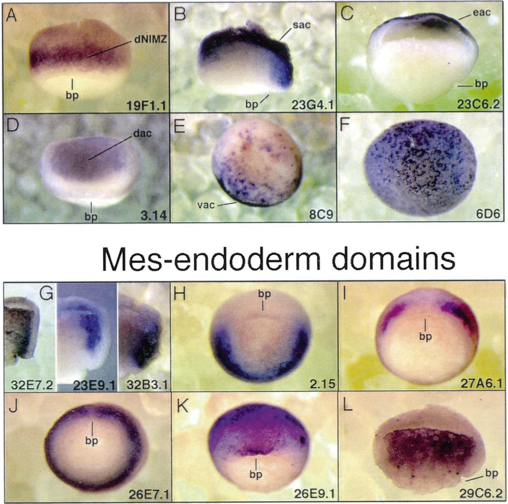 Fig. 4. Gastrula regionalization. Whole-mount in situ hybridizations of gastrula embryos are shown. Expression in ectodermal and mes-endodermal domains is shown in upper and lower panel, respectively.(A,D,K) Dorsal view with animal pole facing up; (B,C,G,L), mid-sagittal sections, dorsal facing right, animal pole facing up; (E,F) animal view, dorsal facing up. (H,I,J) Vegetal view, dorsal facing up. bp, Dorsal blastopore lip; dac, dorsal animal cap; dNIMZ, dorsal non-involuting marginal zone; eac, epithelial layer of animal cap; sac, sensorial layer of animal cap; vac, ventral animal cap. |