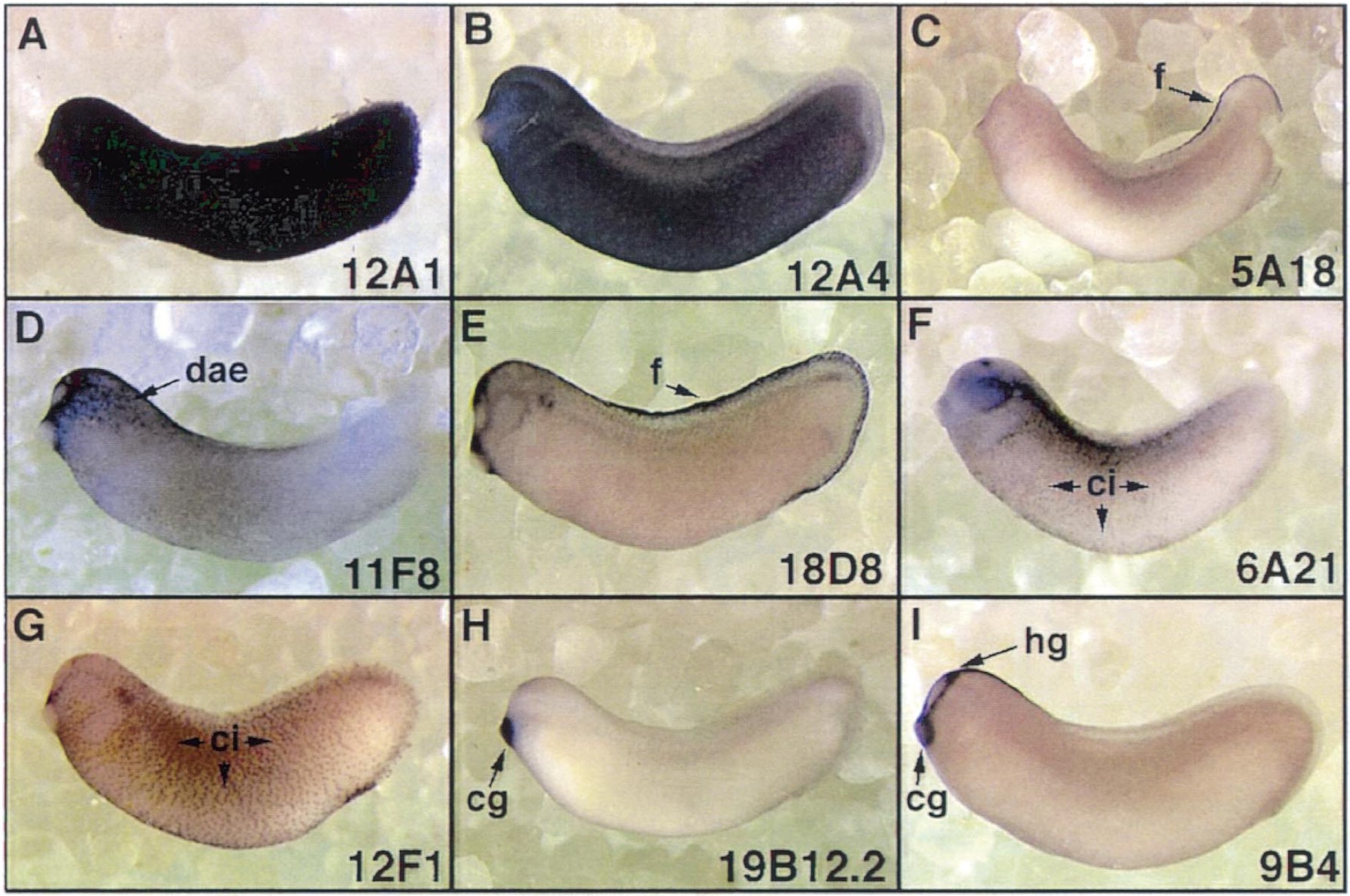 Fig. 6. Epidermal regionalization. Whole-mount in situ hybridizations of tailbud embryos are shown in lateral view. (A,B) Show pan-epidermal markers and (C) show genes with expression in various epidermal regions. cg, Cement gland; ci, ciliated cells; dae, dorsoanterior epidermis; f, fin; hg, hatching gland. |
