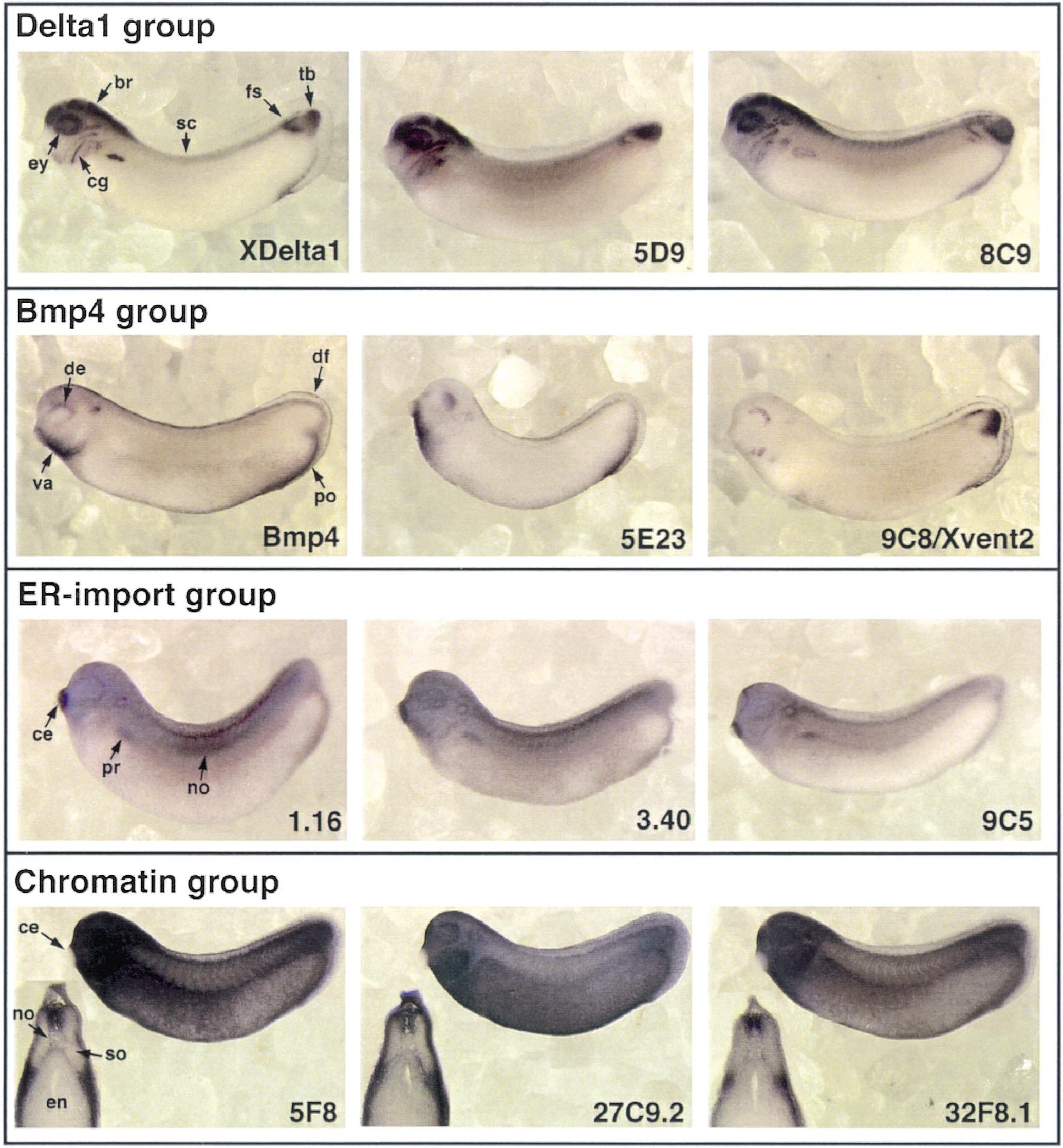 Fig. 7. Synexpression groups. Whole-mount in situ hybridizations of tailbud embryos are shown in lateral view. Four groups of genes with shared, complex expression patterns (synexpression groups) are shown (see also Table 3). For the Delta1-group, expression patterns of XDelta1 and two group representatives are shown. For the Bmp4 group, expression patterns of Bmp4 and the two group representatives are shown. For the ER-import group, expression patterns of three group representatives are shown. For the chromatin group expression patterns of three group representatives are shown, with inserts displaying transverse sections of the trunk. Arrows indicate stained structures common to all members of the group. Bmp4 and XDelta1 were not isolated in this screen. Note, that the absence of staining in the endoderm of the chromatin group genes is probably due to technical difficulties to stain this tissue. Abbreviations: br, brain; ce, cement gland; de, dorsal eye; df, dorsal fin; en, endoderm; ey, eye; fs, forming somites; no, notochord; po, proctodeum; pr, pronephros; sc, spinal cord; so, somites; tb, tailbud; va, ventral visceral arches. |