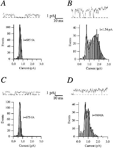 Figure 4. Sample traces and amplitude histograms obtained from the same patch without (A and B) or with (C and D) 5 mM NaCl added to the intracellular side, at either 0 (A and C) or +80 mV (B and D). The single channel currents are obtained from the fit to a Gaussian distribution. The smaller amplitude in the histograms at +80 mV corresponds to the amplitude of the flickering of the channel, and remains constant in the absence (B) or in the presence (D) of Na+.