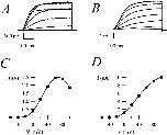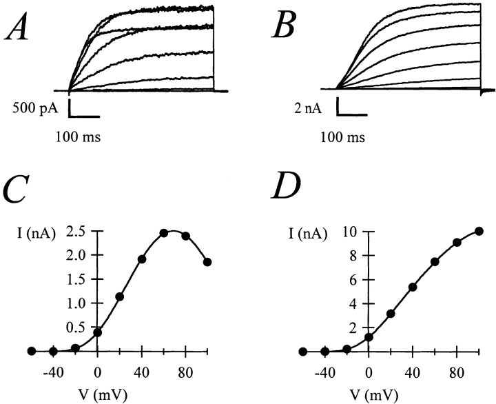Figure 7. Variability in the degree of blockade by internal Na+ in CHO-K1 cells. (A and B) Raw currents traces obtained from two apparently identical cells (500-ms depolarizations to voltages between −60 and +100 mV, in 20-mV increments). (C and D) Corresponding I-V relationships. The internal solution contained 140 mM KCl and 10 mM NaCl.