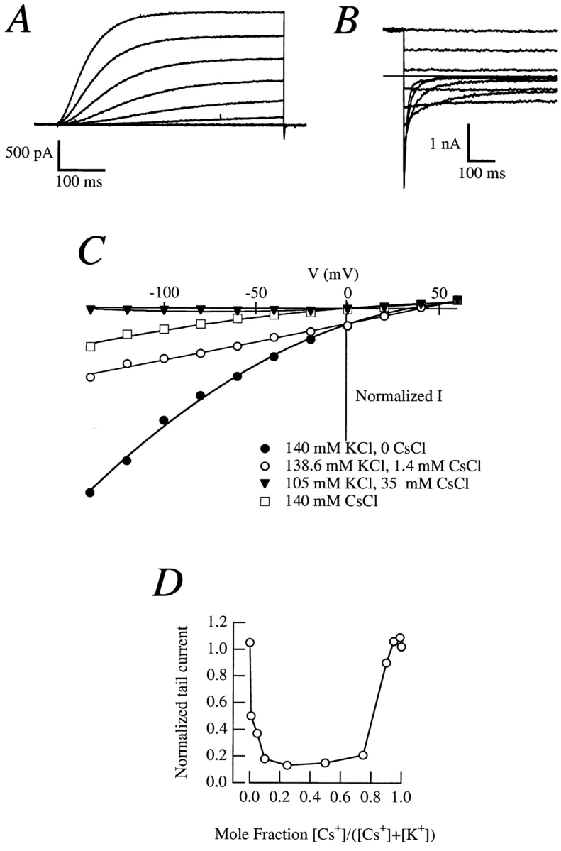 Figure 8. (A) Outward currents in a CHO-K1 cell expressing r-eag exposed to an internal solution containing Cs+ as the sole charge carrier; the same internal solution was used in B–D. (B) Tail currents in a cell exposed to an external solution containing (mM) 140 CsCl, 2 CaCl2, 2 MgCl2, 10 Hepes/CsOH, pH 7.2. The reversal potential is ∼0 mV. (C) Instantaneous I-V plots in cells with Cs+ internal solution and varying extracellular K+ and Cs+ concentrations. (D) Anomalous mole fraction effect obtained from tail currents in a cell perfused with different K+-Cs+ mixtures. The tail current at −100 mV (extrapolation to t = 0 of the exponential decay of the amplitude) was normalized to the outward current at +60 mV (mean amplitude at the final 10% of the pulse).