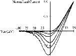 Figure 9. Normalized currents obtained during voltage ramps in CHO-K1 cells expressing r-eag currents. The internal solution contained Cs+ as charge carrier, and the external solution contained K+. From a holding potential of −100 mV, the cell was progressively depolarized to +75 mV during 1 s. Notice the strong variability in the reversal potential, while the shape of the current is similar in all cases.