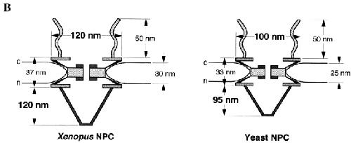 Figure 8. Schematic representation of the yeast NPC with the 3D localization of three Nsp1p subcomplexes. The Nsp1p–Nup49p–Nup57p– Nic96p complex (i.e., the Nsp1p complex) is localized at both the cytoplasmic and nuclear periphery of the central gated channel, and the Nsp1p–Nup82p complex resides only at the cytoplasmic periphery of the central gated channel. In addition, a third Nsp1p complex consisting of Nsp1p interacting with Nic96p is located at the terminal ring of the nuclear baskets. c, cytoplasmic, and n, nuclear side of the NE.