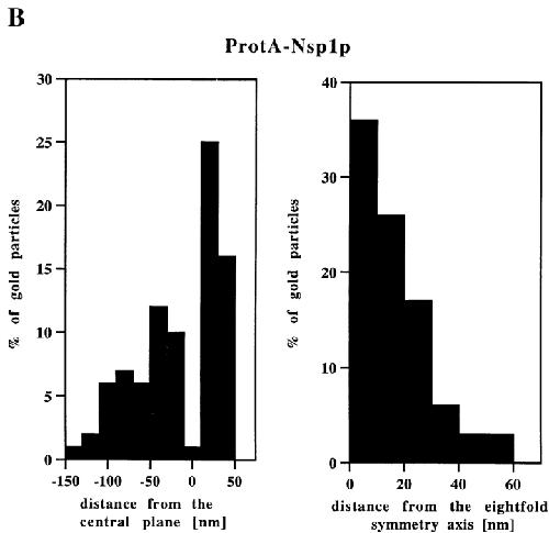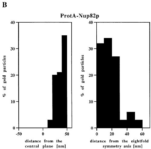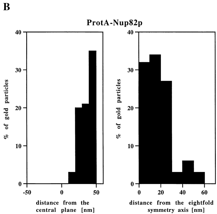 Figure 6. Nup82p is found only at the cytoplasmic periphery of the central gated channel. (A) Triton X-100–extracted spheroplasts from ProtA–Nup82p cells were pre-immunolabeled with an anti–protein A antibody directly conjugated to 8-nm gold. Shown are a stretch along the NE and a gallery of selected examples of gold-labeled NPC cross sections. c, cytoplasm; n, nucleus. Bars, 100 nm. (B) The quantitative analysis of the gold particle distribution revealed that Nup82p resides in the center of the NPC in a distance of ∼40 nm from the central plane of the NPC. 106 gold particles were scored for the quantitative analysis.