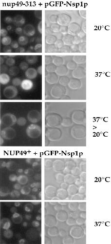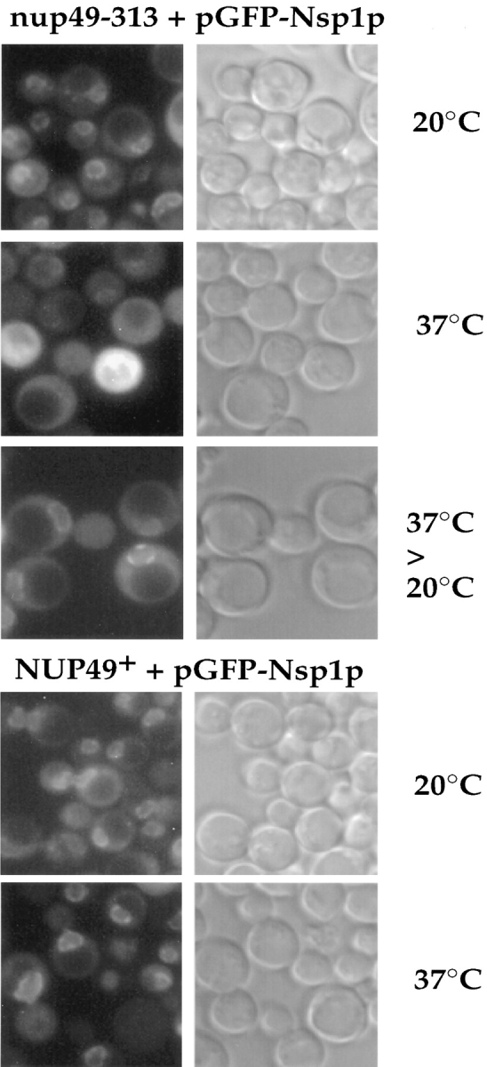 Figure 7. In vivo location of GFP-tagged Nsp1p in nup49-313 cells. NUP49+ and nup49-313 cells transformed with a single copy ARS/CEN/ADE2 plasmid harboring a fusion construct between GFP and the Nsp1p COOH-terminal domain were grown at permissive temperature (20°C) or shifted for 6 h to restrictive temperature (37°C). In the case of the nup49-313 strain, cells were regrown after a 6-h shift to 37°C for a further 2 h at the permissive temperature (20°C). Cells were inspected in the fluorescence microscope to detect the GFP fusion protein and also viewed by Nomarski optics.