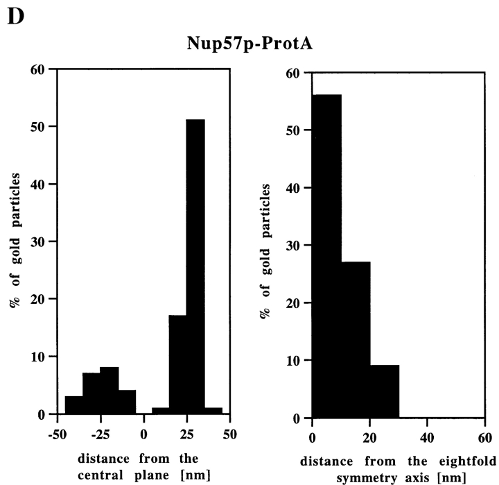 Figure 5. Nup49p (A) and Nup57p (C) are located at the cytoplasmic and the nuclear periphery of the central gated channel. Triton X-100–extracted spheroplasts from the ProtA–Nup49p and Nup57p–ProtA strains were incubated with an anti– protein A antibody conjugated to 8-nm colloidal gold (B and D). c, cytoplasm; n, nucleus. Distribution of the gold particles associated with NPCs in the ProtA–Nup49p and Nup57p–ProtA strains, respectively. 79 and 93 gold particles were scored, respectively. Bars, 100 nm.