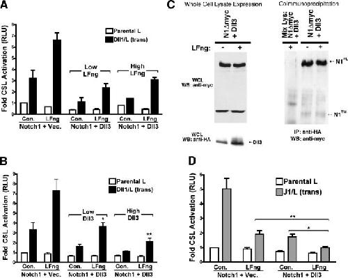 Figure 6. LFng and Dll3 dynamically modulate N signaling. (A) NIH 3T3 cells cotransfected with N1 and CSL reporter as well as vector or Dll3 with increasing amounts of LFng or control DNA were cocultured with L or Dll1 cells and assayed for luciferase activity. (B) NIH 3T3 cells cotransfected with N1 and CSL reporter as well as control or LFng, and either vector or increasing amounts of Dll3 DNA were cocultured with L or Dll1 cells. P < 0.01. *, a significant difference between vector and Dll3 (low); **, a significant difference between Dll3 (low) and Dll3 (high). n = 5. (C) Lysates from 293T cells cotransfected with N1Δmyc, HA-tagged Dll3, and LFng or control DNA incubated with anti-HA antibody to capture Dll3 immunoprecipitates, which were identified by anti-myc Western blotting to detect N1 (right). Lysate from N1 cells was mixed with equal amounts of D3 lysate and was analyzed alongside other samples (Mix Lys). WCLs were analyzed by anti-myc (top left) and anti-HA Western blotting (bottom left). (D) Parental L or J1 cells cocultured with NIH 3T3 cells that were transfected with N1, CSL reporter, vector, or Dll3 and control or LFng. (*, P < 0.005; **, P < 0.001; n = 7). Error bars represent SD. |