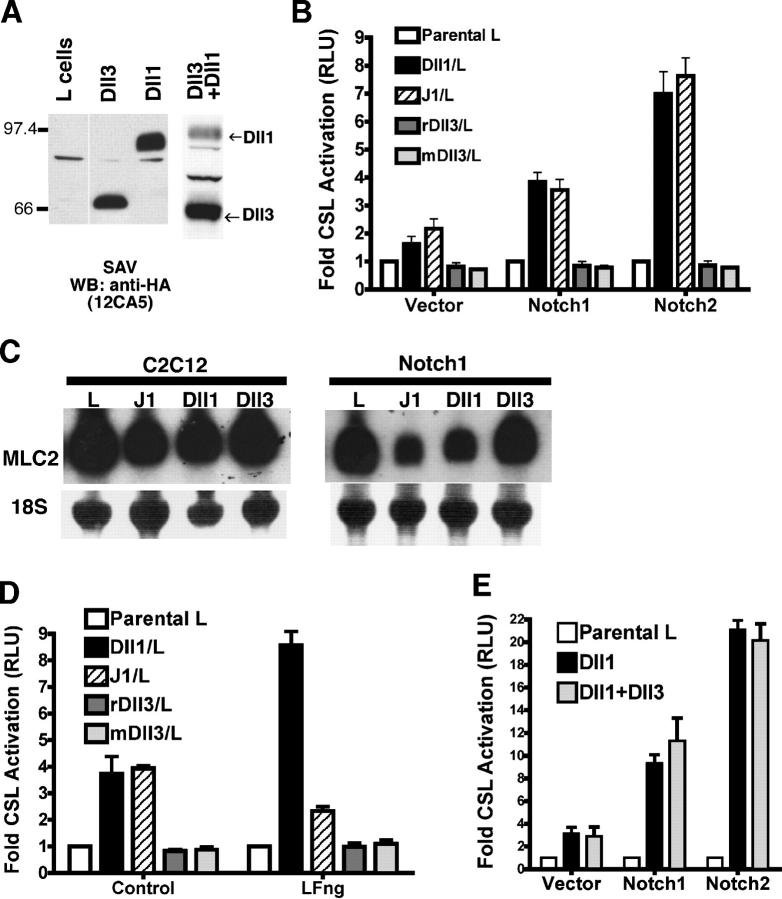 Figure 1. Dll3 does not activate N signaling in trans. (A) Cell surface expression of HA-tagged Dll1, Dll3, and Dll1 + Dll3 L cell lines was determined by biotinylation, streptavidin (SAV) pull-down, and blotting with anti-HA mAb (12CA5). (B) NIH 3T3 cells transfected with N and CSL reporter were cocultured with J1, Dll1, Dll3, mDll3, or parental (L) cell lines and were assayed for luciferase activity. Error bars reflect the SD of the mean from three experiments. RLU, relative luciferase units. (C) Parental C2C12 and cell lines expressing N1 were cocultured with L, J1, Dll1, or Dll3 cells, and myogenesis was monitored by myosin light chain 2 (MLC2) mRNA expression. Loading and transfer of RNA was monitored by methylene blue staining of 18S rRNA. (D) NIH 3T3 cells transfected with N1, CSL reporter, and control or LFng were cocultured with Dll1, J1, rDll3, mDll3, or L cells and were assayed for luciferase activity (n = 3). (E) Parental L, Dll1, or Dll1 + Dll3 cells were cocultured with NIH 3T3 cells transfected with CSL reporter and N or vector. There was no statistically significant difference between Dll1 and Dll1 + Dll3 (n = 3). |
