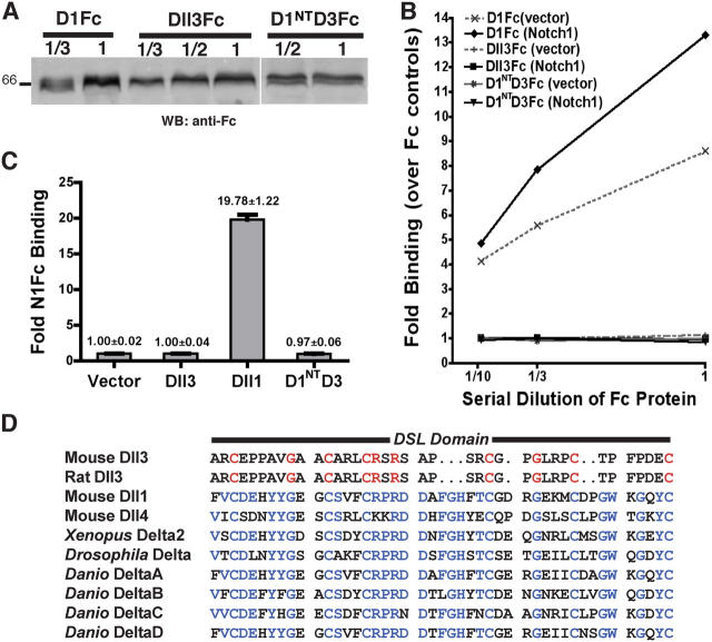 Figure 2. Dll3 does not bind to N. (A) Western Blot (WB) analysis using anti-Fc quantitated Dll3Fc, D1Fc, and D1NTD3Fc for binding assays in B. Numbers represent the dilution of condition media used in the binding assays. (B) 293T cells transfected with vector or N1 were assayed for binding of Fc, Dll3Fc, D1NTD3Fc, and D1Fc by flow cytometry. Fold binding over Fc control is plotted against serial dilutions. (C) Binding of N1Fc to 293T cells transfected with vector or HA-tagged Dll1, Dll3, or D1NTD3 is shown as fold binding over vector control (n = 3). Error bars represent SD. (D) Alignment of the DSL domains of rat and mDll3 with other Dll family members identifies Dll3 as highly divergent. Amino acid sequences conserved in Dll3 are red, whereas amino acid sequences conserved amongst the other Dll-related proteins are blue. |
