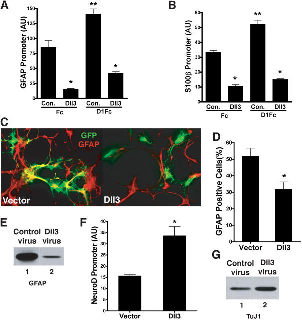 Figure 5. Dll3 suppresses D1Fc-induced astrocytic differentiation. Embryonic day 11.5 mouse cortical NSCs cotransfected with reporters for GFAP (A) or S100β (B) and either vector or Dll3 were treated with control Fc or D1Fc to induce astrogliogenesis. (C) NSCs cotransfected with GFP and either vector or Dll3 were cultured with D1Fc for 4 d and stained for GFAP. (D) Quantitation of transfected cells expressing GFAP from six independent experiments. (E) GFAP expression in NSCs infected with control (lane 1) or Dll3 adenovirus (lane 2) as determined by Western blotting. (F) Neurogenic stage mouse cortical NSCs cotransfected with NeuroD promoter luciferase construct and vector or Dll3. Promoter activation is plotted as relative luciferase units for six experiments. P < 0.05. *, significant differences between Dll3 and vector; **, significant increase between Fc and D1Fc. Error bars represent SD. AU, arbitrary units. (G) Tubulin (TuJ1) expression in NSCs infected with control (lane 1) or Dll3 adenovirus (lane 2) as determined by Western blotting. |