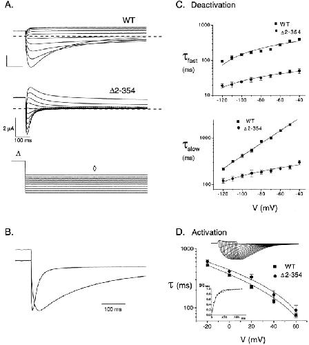 Figure 6. Domains regulating deactivation and inactivation are spatially distinct within the NH2 terminus. (A) Scaled tail currents from Δ2-12 and WT channels show that the small deletion increases deactivation rate. (B) Fast and slow deactivation time constants for WT (n > 10), Δ2-354 (n > 10), and Δ2-12 (n = 6) channels indicate that the two deletions have similar effects on deactivation kinetics. (C) Inactivation time constants for HERG WT (n > 10), Δ2-354 (n > 10), and Δ2-12 (n = 6) show that the small deletion does not significantly alter the inactivation rate (P > 0.6 at 0.05 confidence interval for each voltage).