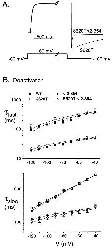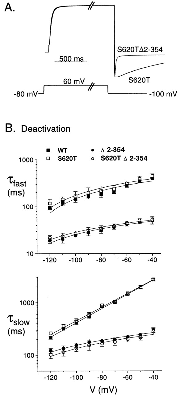 Figure 3. NH2 terminus regulation of deactivation is independent of the inactivation process. (A) Scaled outward currents from S620T and S620T Δ2-354 channels show that deleting the NH2 terminus increases deactivation rate even in the absence of C-type inactivation. (B) Fast and slow deactivation time constants for WT (n ≥ 10), Δ2-354 (n ≥ 10), S620T (n = 6), and S620TΔ2-354 (n = 6) channels showing that the change in deactivation rate due to deletion of the NH2 terminus is the same in the absence of C-type inactivation as in the wild-type background.