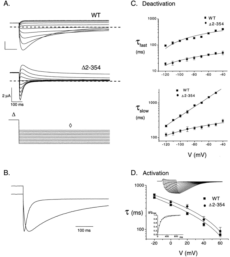 Figure 1. The HERG NH2 terminus slows deactivation but does not alter activation kinetics. (A) Families of tail currents from HERG wild-type (WT) and N deletion (Δ2-354) channels. Channels were allowed to fully activate and inactivate during a 3-s depolarizing pulse to 60 mV, only part of which is shown (Δ); during a subsequent step to potentials ranging from −120 to −40 mV (⋄), currents recovered from inactivation, and then deactivated. The holding potential was −80 mV. The zero current level is indicated by the dashed line. (B) Scaled tail currents evoked by a −100-mV repolarizing pulse from the experiment in A show that Δ2-354 channels deactivate faster than WT channels. (C) Fast (top) and slow (bottom) deactivation time constants obtained from double exponential fits to the closing phase of the tail currents plotted vs. repolarizing voltage values (see methods) for wild-type and Δ2-354 channels (n ≥ 10). Each point represents the mean, and the error bars are SEM for this and all subsequent figures. (D) Activation time constants for WT and Δ2-354 channels are plotted for different voltages. There is no significant difference between these values for WT and Δ2-354 channels (P ≥ 0.58 at confidence interval of 0.05 in one-way analysis of variance test). Top inset shows a series of currents evoked by the envelope of tails protocol to measure time-dependent increases in conductance, as described in methods, with a step to 40 mV (Trudeau et al., 1995; Wang et al., 1997); bottom inset shows exponential fit to resulting conductance vs. time plot (n = 6).