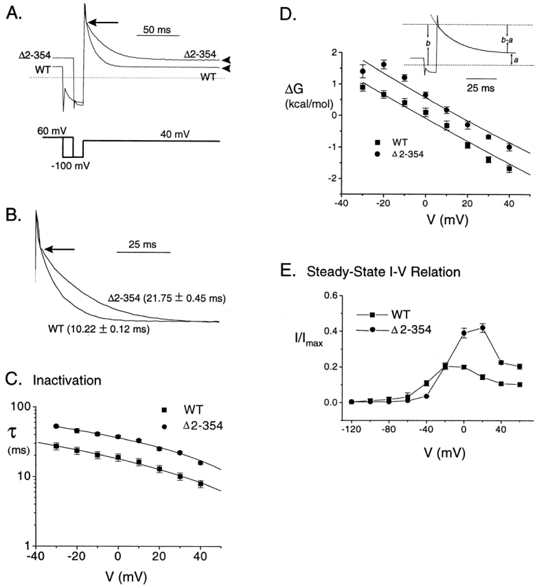 Figure 2. The HERG NH2 terminus promotes C-type inactivation. (A) Inactivating current traces scaled to the peak current from WT and Δ2-354 channels generated using the three-pulse protocol: channels are allowed to fully activate and inactivate during a 3-s prepulse to 60 mV; a subsequent, brief repolarizing pulse to −100 mV allows channels to recover; near the peak of this tail current before deactivation becomes apparent, a third pulse to one of a range of voltages is given to drive channels from the open into the inactivated state (40 mV for the traces shown). The repolarizing pulse is 35 ms in duration for WT, 15 ms for Δ2-354. (Based on our fits, we calculate that recovery is 99.02 ± 0.72%, n = 14, complete for WT and 99.50 ± 0.29%, n = 8 complete for Δ2-354 at the peak of the tail current; i.e., end of recovery phase. This was determined by fitting the recovery phase of the tail currents with a single exponential of the form y = A0 + Ae−t/τ. The fit, which in most cases followed very closely to the peak currents, was extended beyond the peak to a plateau. The current level of the plateau was considered to represent the full recovery from inactivation. The amplitude of the peak tail current was normalized to this value to give the percentage of recovery, the mean values for which are reported above.) Thus, an inactivating current is measured in relative isolation from other kinetic components. Arrowheads point to the steady state inactivation level of WT and Δ2-354 channels. The dashed line indicates the zero current level. The capacitance artifact (∼2 ms) ends at the arrow. Capacitance artifacts are also shown at the beginning of the tail currents upon repolarization. (B) Currents from A scaled to peak and minimum to show the difference in time course. Time constants extracted from single exponential fits are shown along with the error of the fit. The arrow corresponds to the settling of the clamp as shown in A. (C) Inactivation time constants extracted from single exponential fits to the inactivating current illustrated in A are plotted at different voltages (n ≥ 10). (D) Change in free energy as a function of voltage shows that deletion of the NH2 terminus increases the free energy of the inactivated state relative to the open state (n = 6). The free energy change associated with open to inactivated transition can be calculated as ΔGO ↔ I = −RTlnKO ↔ I = −RTln(I/O) = RTln(O/I), where ΔG is the difference in free energy between the open and closed states. I and O are the fraction of channels in the inactivated and open states, respectively, R is the gas constant and T is the temperature. The fraction of open and inactivated channels are measured from the inactivation current as illustrated in the inset: the instantaneous outward current level, indicated as b, reflects the total number of channels that are open and ready to undergo the open to inactivated transition. The value for b is determined by fitting the inactivating current with a single exponential function and extrapolating back to the moment of the voltage change; the fit departs from the recorded current during the capacitive artifact, which has a duration of ∼2 ms. The steady state current level (the channels remaining in O) is indicated as a. Thus, the number of inactivated channels can be calculated as (b − a). Then, at any given voltage, ΔGO ↔ I = RTln(O/I) = RTln[b/(b − a)]. The example shown is a Δ2-354 current. (E) Normalized steady state outward current–voltage relationships for WT and Δ2-354 channels (n = 6). All outward currents are normalized to the maximal tail current level evoked at −100 mV subsequent to a 3-s step to 60 mV, which represents the channel expression level for each oocyte assuming the same single-channel conductance for the two constructs.