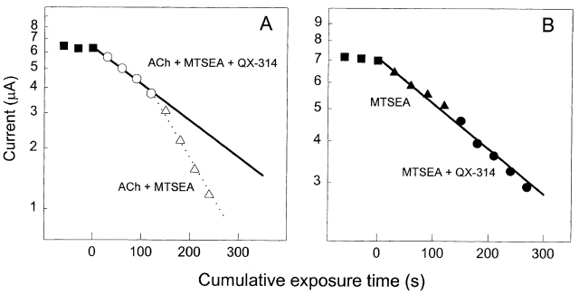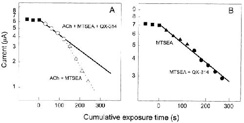 Figure 6. The dependence on ACh of the protection by QX-314 against the irreversible inhibition by MTSEA. The mutant was αT244C. The log of the ACh-induced current is plotted against the cumulative time of application of MTSEA. (A) QX-314 added in the presence of ACh. (B) QX-314 added in the absence of ACh. (▪) Responses to 60 μM ACh before MTSEA was added. (○) Responses to ACh after 25-s applications of 2.5 μM MTSEA plus 60 μM ACh plus 0.1 mM QX-314. (▵) Responses to ACh after 25-s applications of 2.5 μM MTSEA plus 60 μM ACh. (▴) Responses to ACh after 25-s applications of 250 μM MTSEA. (•) Responses to ACh after 25-s applications of 250 μM MTSEA plus 1 mM QX-314.