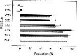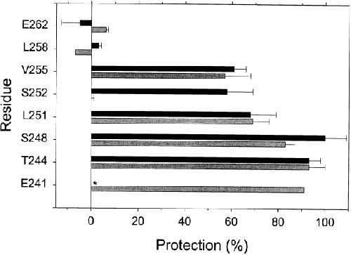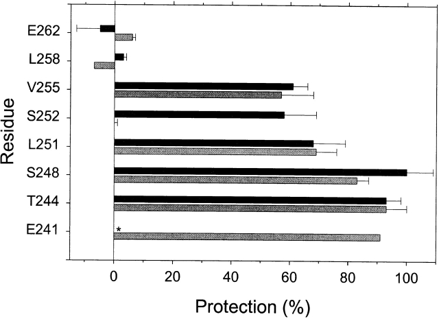 Figure 8. The protection by QX-314 and QX-222 of Cys-substituted residues in M2 against reaction with MTSEA. For each mutant, the rate constant of the reaction in the presence of channel blocker and ACh (kblocked) and the rate constant of the reaction in the presence of ACh alone (kopen) were determined as described in methods. The extent of protection is taken as 1 − (kblocked/kopen). The means of two to four determinations and average errors or SEM are plotted. The lighter bars represent the protection by QX-314, and the darker bars represent the protection by QX-222. *ND.
