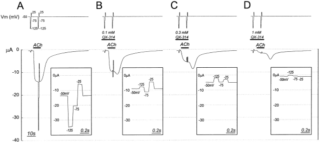 Figure 4. Inhibition of ACh-induced current in αL251C by QX-314 at different holding potentials. The top trace shows the holding potential. Both before and ∼3 s after the application of 25 μM ACh, the holding potential was stepped from −50 mV to −125, −75, −25, and back to −50 mV. The bottom trace shows the current. (inset) The peak ACh-induced current during the voltage steps minus the current during the voltage steps before ACh was added, with an expanded time axis. (A) No QX-314, (B) 0.1 mM QX-314, (C) 0.3 mM QX-314, (D) 1 mM QX-314. The four sections are part of a single experiment. Between the sections shown, the oocyte was washed and QX-314 at the indicated concentration was applied for 45 s before, and in addition to, the time indicated in the traces.