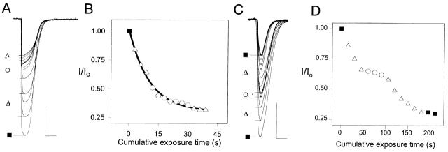 Figure 5. The effect of QX-314 on the irreversible inhibition of the ACh-induced current in two mutants. (A and B) αL258C. (C and D) αS248C. A and C show the test responses to ACh between applications of MTSEA in the presence of ACh and in the presence or absence of QX-314. B and D show the test currents as a function of cumulative exposure time to MTSEA. (▪) Initial responses and, in C and D, also extra final responses without any further application of MTSEA. (▵) MTSEA in the presence of ACh. (○) MTSEA in the presence of both ACh and QX-314. ACh was applied at 25 μM to αL258C and at 100 μM to αS248C. 1 mM MTSEA was applied in 3-s pulses to αL258C, and 1.5 mM MTSEA was applied in 15-s pulses to αS248C. QX-314 was applied at 1 mM to αL258C and at 0.2 mM to αS248C. The calibration bars are 3 s and 5 μA.