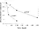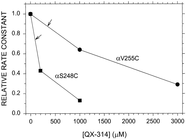 Figure 7. The dependence of protection on blocker concentration. The rate constant for the reaction of MTSEA in the presence of ACh at 10× EC50 and of the indicated concentration of QX-314 is divided by the rate constant in the presence of ACh but absence of QX-314. The mutants are αV255C (•) and αS248C (▪). The arrows mark the interpolated values of the relative rate constants at the IC50s for QX-314 inhibition of the ACh-induced current (Table I).