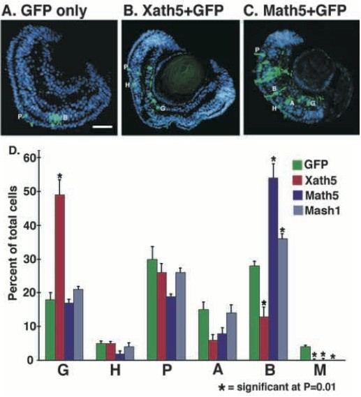 Fig. 6. In vivo lipofection of Math5 promotes retinal bipolar cell fates. Embryos were transfected at stage 18 in the region of the optic vesicle with DNA for GFP alone (A) or GFP in combination with Xath5 (B), Math5 (C) or Mash1 (not shown). At stage 41 these embryos were fixed, cryosectioned and stained with Hoechst dye to visualize the retinal cell layers. GFP-labeled cells were scored in retinal sections by laminar position and morphology. In section of embryos transfected with Xath5, there are more labeled cells in the RGC layer (B), while sections of embryos transfected with Math5 show both a larger number of GFP-labeled cells overall and more labeled bipolar cells (C). Bipolar cells were scored as cells with distinct cell bodies in the INL and with thin processes extending radially but not extending into the ONL or GCL. These can be distinguished from Müller glial cells, which are radially oriented but have a more complex morphology (see Dorsky et al, 1995). (D) Percentage of retinal cell types labeled following transfection with DNA for GFP (green, n=432 cells from 5 eyes), GFP plus Xath5 (red, n=939 cells from 5 eyes), Math5 (navy, n=866 cells from 7 eyes) or Mash1 (light blue, n=440 cells from 6 eyes). Xath5 data are derived from Kanekar et al. (1997) and are included here for comparison. Expression of Xath5 biases progenitors toward RGC fate, while both Math5 and Mash1 promote the formation of bipolar cells. The per cent representation of each cell type was calculated as a weighted average. Error bars indicate SEM; asterisk, P<0.01 by Student t-test. Cell types on the graph are listed from left to right in rough order of birth. Abbreviations: G, retinal ganglion cell; B, bipolar cell; P, photoreceptor; A, amacrine cell; H, horizontal cell. Scale bar 0.5 μm.