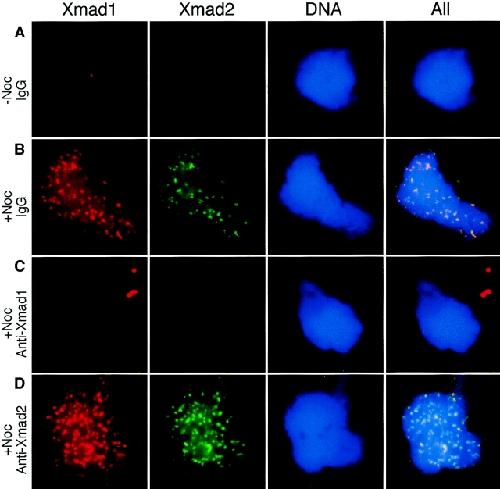 Figure 9. Anti-Xmad1 antibodies interfere with Xmad1 and Xmad2 binding to kinetochores. Metaphase chromosomes were assembled in egg extracts and treated with (B–D) or without (A) nocodazole. C and D, anti-Xmad1 and anti-Xmad2 antibodies, respectively, were added to the extracts 1 h before the addition of nocodazole. The chromosomes were isolated through a sucrose cushion and stained for Xmad1 and Xmad2. For D, Xmad2 staining is essentially the same if the anti-Xmad2 antibody was omitted during the immunofluorescent staining procedures (data not shown). Aggregates of chromosomes from several sperm nuclei are shown.