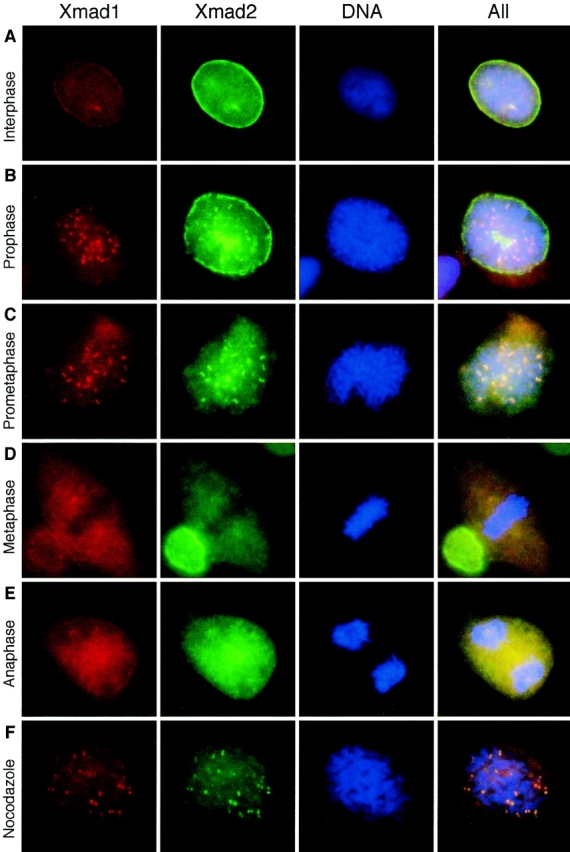 Figure 8. Xmad1 localized to unattached kinetochores during mitosis. Asynchronously growing XTC cells (A–E) or cells treated with nocodazole (F) were fixed in 3% paraformaldehyde and stained with affinity-purified mouse anti-Xmad1 and rabbit anti-Xmad2 antibodies as indicated on top. Texas red– conjugated anti–mouse and fluorescein-conjugated anti– rabbit IgG antibodies were used as secondary antibodies. The nuclei were viewed by staining with the DNA-binding dye Hoechst 33258 (DNA). The merges of all three fluorochromes are also shown (All). The cell cycle stages were determined by the morphology of the cell and its chromosomes. A, interphase; B, prophase; C, prometaphase; D, metaphase; E, anaphase; F, a nocodazole-arrested cell. Representative pictures of each cell type are shown.