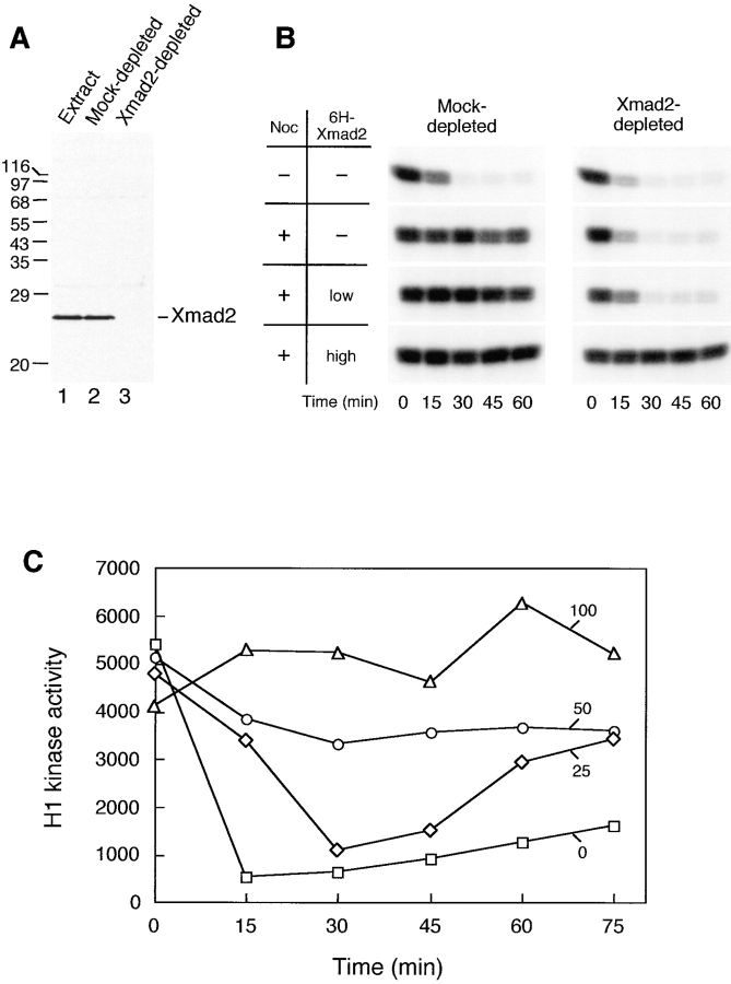 Figure 1. Excess Xmad2 protein inhibits exit from mitosis in CSF-arrested extracts. (A) Immunoblot of Xmad2 in egg extracts (lane 1), in mock-depleted extracts (lane 2), and in Xmad2-depleted extracts (lane 3). Extracts shown in lanes 2 and 3 were used in the experiment shown in B. The migration of molecular size standards and Xmad2 is indicated on the left and right, respectively. (B) Autoradiogram of histone H1 kinase assay. Mock- or Xmad2-depleted CSF-arrested egg extracts were treated as indicated on the left: low 6H-Xmad2, recombinant 6H-Xmad2 protein supplemented to the level of endogenous protein; high 6H-Xmad2, 6H-Xmad2 added to 17-fold the concentration of endogenous protein. After 1 h of incubation on ice, sperm nuclei (10,000/μl) were added to all samples and incubated for 10 min at 23°C, followed by incubation with nocodazole (lower three panels) for another 10 min. The metaphase arrest was then released by the addition of calcium chloride to inactivate CSF activity. Aliquots were taken immediately before calcium was added (time 0) and every 15 min thereafter to determine Cdc2-associated histone H1 kinase activity. (C) Dose-dependent inhibition of Cdc2 inactivation by Xmad2. Xmad2 protein at the indicated concentrations (□, 0; ⋄, 25; ○, 50; ▵, 100 ng/μl of extract, respectively) was preincubated with CSF-arrested extracts, followed by incubation with sperm nuclei (500/μl) in the absence of nocodazole. H1 kinase assays were performed as described in B and incorporation of 32P into H1 was quantified using a PhosphorImager.