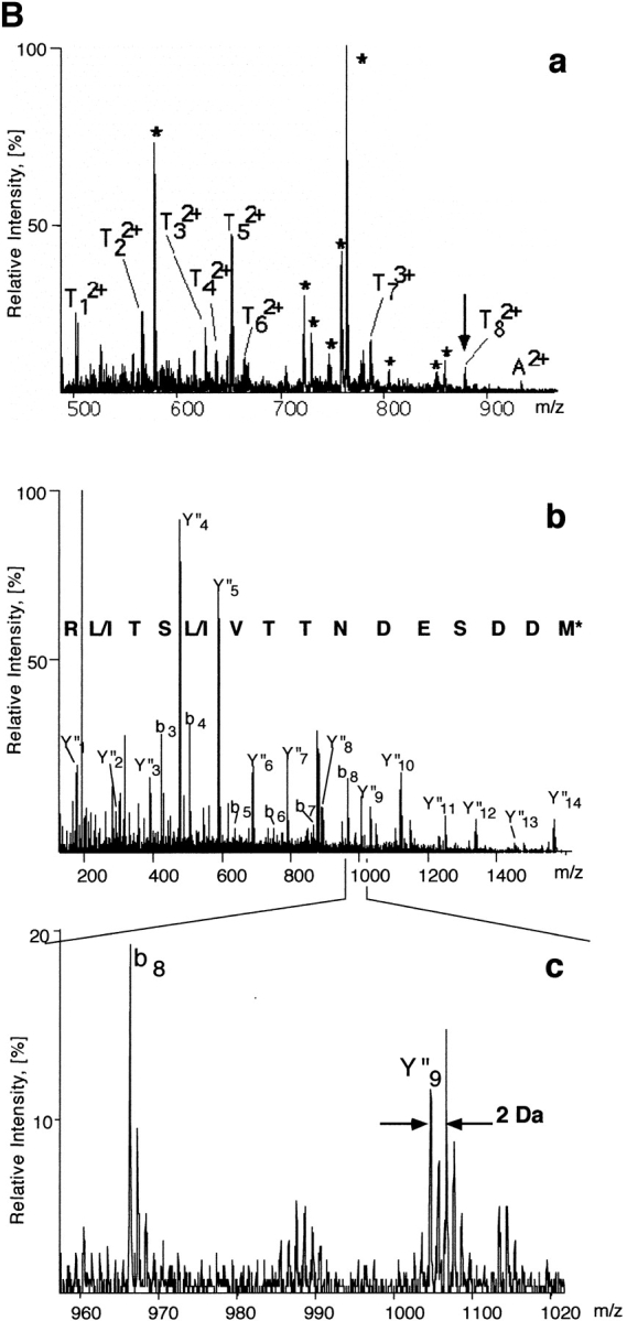 Figure 4. (A) Xmad2 associates with an 85-kD protein in CSF-arrested extracts. Immunoprecipitation was performed by using a control antibody (lanes 1 and 3) or an anti-Xmad2 antibody (lanes 2 and 4) as indicated. The immunoprecipitates were washed with a buffer containing 1% Triton X-100 (lanes 1 and 2) or 0.1% SDS (lanes 3 and 4). The proteins were resolved by SDS-PAGE and stained with Coomassie blue. The migration of p85, IgG, and Xmad2 is indicated on the left, and that of molecular weight standards on the right. (B) Sequencing of Xmad1. The unseparated pool of tryptic peptides recovered from the gel matrix was analyzed using a novel quadrupole TOF mass spectrometer. (a) Mass spectrum of the unseparated tryptic digest of the Xmad1 band. The peptide ions designated with T were in turn isolated by a quadrupole mass analyzer, fragmented in the collision cell, and then their tandem mass spectra were acquired with a reflector time-of-flight module. Peaks designated with asterisks are trypsin autolysis products. The peptide ion designated with A belongs to the antibody used in the purification of Xmad1. (b) Tandem mass spectrum of the doubly charged peptide ion T8 (marked with an arrow in a). Upon collisional fragmentation, tryptic peptides tend to produce a continuous series of fragment ions containing the COOH terminus (Y″ ions; Roepstorff and Fohlman, 1984). The peptide sequence (shown above) is deduced by considering precise mass differences between adjacent Y″ ions. M*, N-acetylated methionine sulfoxide amino acid residue. The spectrum also contains minor series of the NH2-terminal fragment ions (B ions) as well as internal fragment ions. Therefore to deduce the sequence with high confidence it is necessary to distinguish Y″ ions from the other ions in the spectrum. This has been achieved by selective isotopic labeling of the COOH-terminal carboxyl group of the peptides. (c) A zoom of the region in the tandem mass spectrum of T8 shows the principal of sequence readout of isotopically labeled peptides. Upon tryptic cleavage of the protein in a buffer containing H216O/H218O 1:1 (vol/vol) COOH-terminal carboxyl groups of peptide molecules incorporate 16O and 18O atoms in a 1:1 ratio. Thus the fragment ions containing the COOH terminus of the peptide (mostly Y″ ions) appear in the fragment spectrum as a characteristic isotopic pattern—a doublet split by 2 D. B ions or other fragment ions not containing COOH-terminal carboxyl group are observed as ions having normal isotopic pattern.