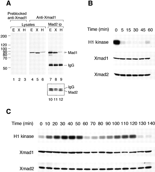The spindle checkpoint prevents the metaphase to anaphase transition in cells containing defects in the mitotic spindle or in chromosome attachment to the spindle. When the checkpoint protein Xmad2 is depleted from Xenopus egg extracts, adding Xmad2 to its endogenous concentration fails to restore the checkpoint, suggesting that other checkpoint component(s) were depleted from the extract through their association with Xmad2. Mass spectrometry provided peptide sequences from an 85-kD protein that coimmunoprecipitates with Xmad2 from egg extracts. This information was used to clone XMAD1, which encodes a homologue of the budding yeast (Saccharomyces cerevisiae) checkpoint protein Mad1. Xmad1 is essential for establishing and maintaining the spindle checkpoint in egg extracts. Like Xmad2, Xmad1 localizes to the nuclear envelope and the nucleus during interphase, and to those kinetochores that are not bound to spindle microtubules during mitosis. Adding an anti-Xmad1 antibody to egg extracts inactivates the checkpoint and prevents Xmad2 from localizing to unbound kinetochores. In the presence of excess Xmad2, neither chromosomes nor Xmad1 are required to activate the spindle checkpoint, suggesting that the physiological role of Xmad1 is to recruit Xmad2 to kinetochores that have not bound microtubules.