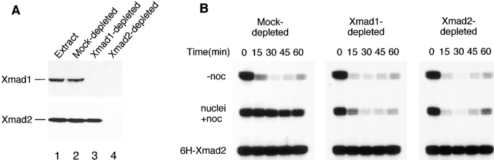 Figure 10. Mitotic arrest induced by excess Xmad2 is independent of Xmad1. (A) Immunoblots of Xmad1 (top) and Xmad2 (bottom) in CSF-arrested extracts (lane 1), mock- (lane 2), Xmad1- (lane 3), or Xmad2-depleted (lane 4) extracts. (B) Excess Xmad2 can still induce a mitotic arrest in the absence of Xmad1. The extracts shown in lanes 2–4 of A were used. Top panels, extracts were incubated with sperm nuclei alone. Middle panels, nocodazole and sperm nuclei were added to activate the spindle checkpoint. Bottom panels, excess 6H-Xmad2 was added to the extracts in the absence of sperm nuclei and nocodazole. H1 kinase activities were determined before and at various times after calcium addition as described for Fig. 1 B.