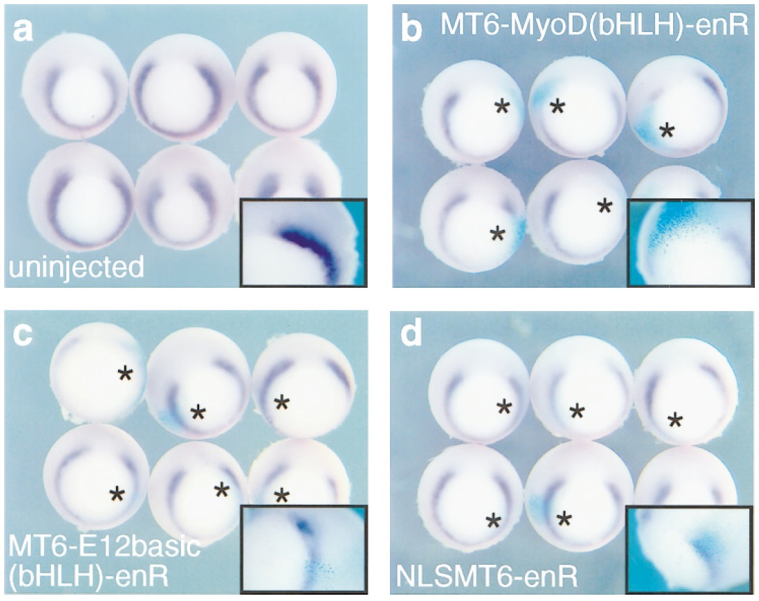 MT6-MyoD(bHLH)-enR (50 pg/embryo); (c) MT6-E12basic(bHLH)-enR (50 pg/embryo); (d) NLSMT6-enR (200 pg/embryo). Asterisks mark