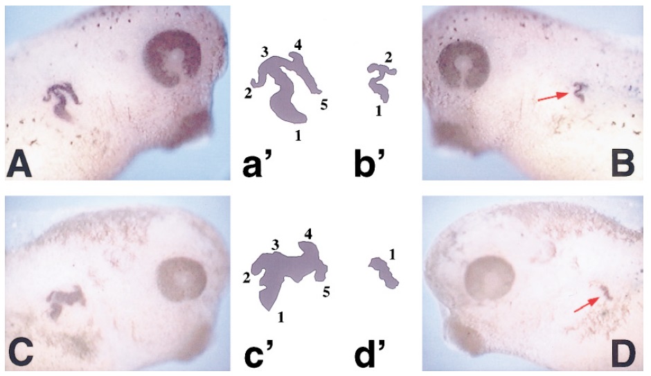 the pronephric region of the injected side (B). (a9 and b9). Enlarged, diagrammatic representation of the pronephroi in A and B. For