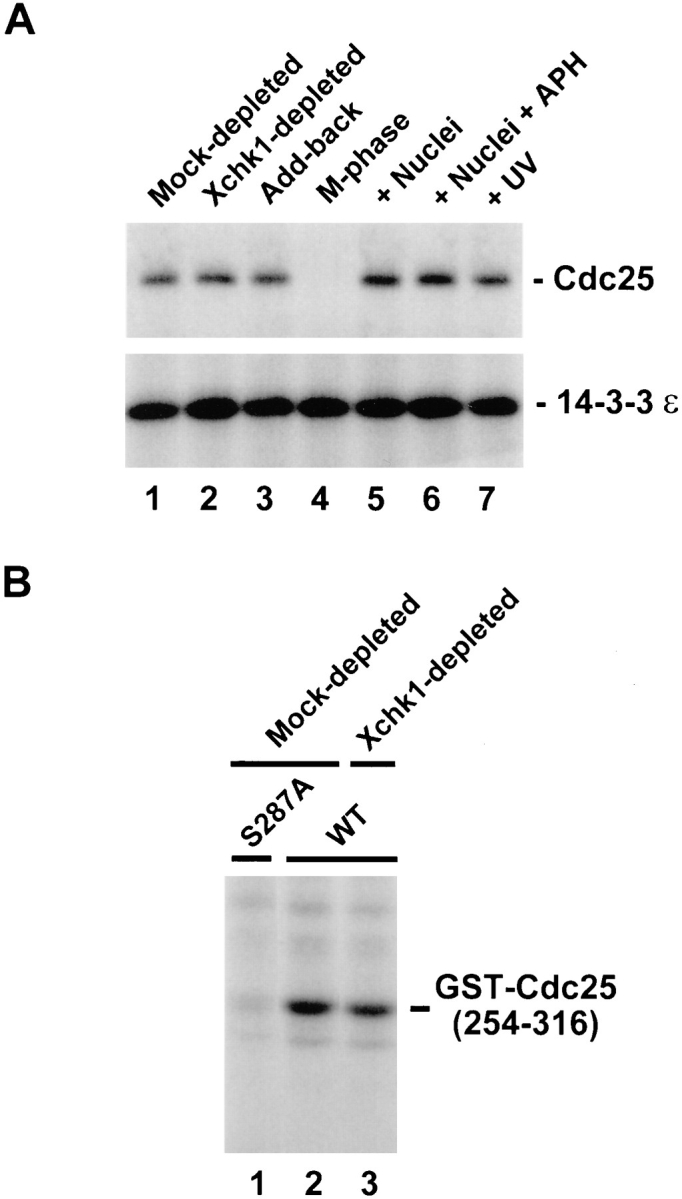 We have analyzed the role of the protein kinase Chk1 in checkpoint control by using cell-free extracts from Xenopus eggs. Recombinant Xenopus Chk1 (Xchk1) phosphorylates the mitotic inducer Cdc25 in vitro on multiple sites including Ser-287. The Xchk1-catalyzed phosphorylation of Cdc25 on Ser-287 is sufficient to confer the binding of 14-3-3 proteins. Egg extracts from which Xchk1 has been removed by immunodepletion are strongly but not totally compromised in their ability to undergo a cell cycle delay in response to the presence of unreplicated DNA. Cdc25 in Xchk1-depleted extracts remains bound to 14-3-3 due to the action of a distinct Ser-287-specific kinase in addition to Xchk1. Xchk1 is highly phosphorylated in the presence of unreplicated or damaged DNA, and this phosphorylation is abolished by caffeine, an agent which attenuates checkpoint control. The checkpoint response to unreplicated DNA in this system involves both caffeine-sensitive and caffeine-insensitive steps. Our results indicate that caffeine disrupts the checkpoint pathway containing Xchk1.