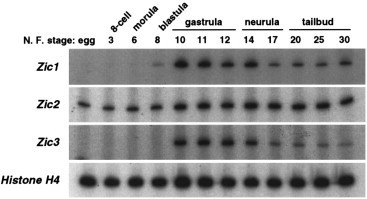 Fig. 2. Temporal expression profiles of Xenopus Zic1, Zic2 and Zic3 during Xenopus development. RNA was extracted from embryos at the indicated stage of development and Zic1, Zic2 and Zic3 mRNA expression levels were measured by RT-PCR. The ubiquitous marker Histone H4 served as a control. |