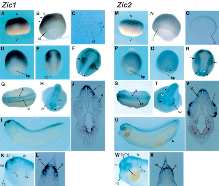 Fig. 3. Spatial expression patterns of Zic1 and Zic2 in Xenopus embryos. Series of embryos were hybridized with digoxigenin-labeled antisense Zic1 (AâL) and Zic2 (MâX) RNA. (A,M) blastula stage (stage 9). In the blastula stage, Zic1 and Zic2 were expressed throughout the ectoderm (A, animal side; V, vegetal side). (B,C,N,O) mid-gastrula stage (stage 10.5). (C) The expression of Zic1 in the prospective neural plate was confirmed in a cross-section of the same embryo as in B (arrowhead). However, Zic2 was expressed in a broader region of the ectoderm (N,O). (D,P) Stage 11â12. (E,Q) Stage 12.5â13.5. (F,R) Stage 14â15. White and black arrowheads indicate the lateral edge of the neural plate and the neural crest, respectively. Arrows indicate the neural plate border region of the prospective rhombencephalon. (G,H,S,T) Stage 20. The black arrowhead, white arrowhead and arrow indicate the telencephalon, diencephalon and mesencephalon, respectively. (IâL,UâX) Stage 30. Transverse section through the head (J,V) and trunk region (L,X) of the same embryo as in (I,U). (K,W) magnified views in the head region of I and U. (A,M,I,U) are lateral views. The upper side of the panel is the animal side in (A,M). (B,N) Dorsal-vegetal views. (DâG,PâS) Dorsal views. (DâF,PâR) anterior side is upper side. (G,S) The anterior side is toward the left. (H,T) Anterior views of (G,S). The upper side is dorsal. dl, dorsal lip; bp, blastopore; s, somite; nt, neural tube; ov, optic vesicle; tel, telencephalon; di/mi, diencephalon and midbrain boundary; rh, rhombencephalon; e, eye; ev, ear vesicle; cg, cement gland. |
