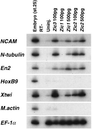 Fig. 7. Zic1 and Zic2 induced anterior neural marker genes and a neural crest marker gene without mesoderm induction in animal cap explants, as seen with Zic3 Embryos were injected with MT-Zic3 or MT-Zic1 mRNA at the two-cell stage. Animal caps were explanted at stage 9 and cultured. When sibling embryos reached stage 25, the expression of anterior-posterior marker genes (En2 and HoxB9 (=Xlhbox6)), a pan-neural marker gene (NCAM), a neuronal differentiation marker (N-tubulin), a neural crest marker (Xtwi), and a dorsal mesodermal marker (M. actin; muscle actin) were examined by RTâPCR. Although uninjected (Uninj.) caps expressed none of these markers, animal caps injected with Zic1, Zic2, or Zic3 mRNA expressed the anterior marker (En2) and the neural crest marker (Xtwi) while expressing neither the posterior marker (HoxB9) nor the dorsal mesodermal marker (M. actin). In each experiment, sibling control embryos served as a positive control (Embryo) and PCR on the same RNA without reverse transcription was done to verify the absence of genomic DNA (RT-PCR). |