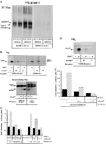 mSmad7 interacts with BMP receptor complexes and inhibits BMP-mediated Smad phosphorylation. A, association of N-terminal Flag-tagged mSmad7 (F-mSmad7) with BMPR-IA and BMPBR-IB in complex with BMPR-II. COS cells were transfected with varioustype I receptors (tagged at C termini with hemaglutinin epitope) with either wild-type (W.T.) or kinase-deficient (K.R.) versions of BMPR-II. The BMP receptors were covalently affinity labeled with 125I-BMP-7, and cell lysates were subjected to immunoprecipitation with Flag antiserum. Equal expression of receptors after transfection was determined directly on aliquots of cell lysates (data not shown). B, mSmad7 inhibits BMPR-IB- and ActR-I-mediated phosphorylation of Smad1. COS cells were transfected with F-Smad1 alone or together with F-mSmad7 in the presence of type I receptors (BMPR-IB or ActR-I) and BMPR-II, after which cells were labeled with [32P]orthophosphate in the absence or presence of BMP-7 and immunoprecipitated with Flag antisera. Expression of F-Smad1 and F-mSmad7 was determined by immunoblotting with Flag on aliquots of cell lysates. C, the32P-label radioactivity associated with Smad1 inpanel B was quantified by using a FujiX Bio-Imager and plotted. D, mSmad7 inhibits BMPR-IB phosphorylation of Smad5. COS cells were transfected with F-Smad5 alone or together with F-mSmad7 in the presence of BMPR-IB and BMPR-II; cells were labeled with [32P]orthophosphate in the absence or presence of BMP-7 and subjected to immunoprecipitation with Flag antisera.E, the 32P-label radioactivity associated with Smad5 in panel D was quantified by using a FujiX Bio-Imager and plotted.