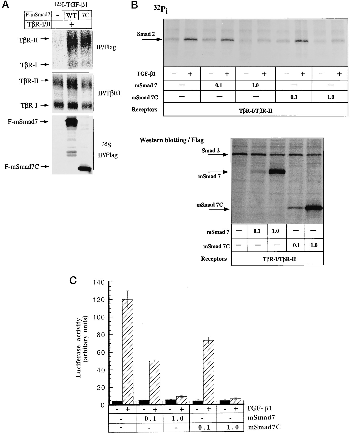 mSmad7 C-domain is sufficient for binding to TGF-β receptor complex and inhibition of TGF-β-induced responses. A, association of wild-type F-mSmad7 (WT) and F-mSmad7C (7C) with TGF-β receptor complex. COS cells were transfected with F-mSmad7 (WT or7C) in combination with TβR-I and TβR-II. The receptors were covalently affinity labeled with 125I-TGF-β1, and cell lysates were subjected to immunoprecipitation with Flag antiserum.B, mSmad7C inhibits TβR-I-mediated phosphorylation of Smad2. COS cells were transfected with F-Smad2 alone or together with F-mSmad7C or wild-type F-mSmad7 in the presence of BMPR-IB and BMPR-II; cells were labeled with [32P]orthophosphate and incubated in the absence or presence of BMP-7, and subjected to immunoprecipitation with Flag antisera. Expression of F-Smad2, F-mSmad7, and F-mSmad7C was determined by immunoblotting with Flag on aliquots of cell lysates.C, transfection of mSmad7C blocks TGF-β-induced p3TPLux transcriptional response but less efficient than wild-type mSmad7.