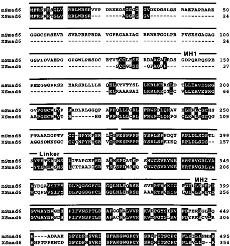 Figure 1. Comparison of deduced amino acid sequences of Xenopus and mouse Smad6. Amino acid identity between mouse Smad6 (mSmad6) and Xenopus Smad6 (XSmad6) is indicated by black boxes. MH1, linker and MH2 domains are denoted above the sequences.