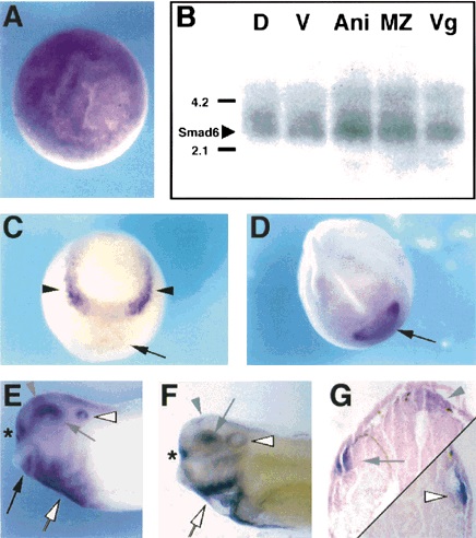 Figure 2. The spatial pattern of expression of Smad6 in developing Xenopus embryos analysed by whole-mount in situ and Northern blot hybridizations. (A) Animal-pole view of a gastrula stage (stage 10) embryo showing uniform Smad6 expression. (B) 10 μg of RNA dissected from the dorsal (D) or ventral (V) halves, or from the animal (Ani), marginal zone (MZ) or vegetal (Vg) thirds of early (stage 10) gastrulae was subjected to Northern blot analysis to detect Smad6 transcripts. The position of 18S (2.1 kb) and 28S (4.2 kb) ribosomal RNAs is indicated to the left of the blot. (C) Anterior-dorsal view of a neurula stage (stage 15) embryo showing Smad6 expression in lateral regions of the anterior neural plate (arrowheads) and weak expression in the prospective cement gland region (arrow) which becomes much stronger by stages 17â18 (D; anterior-dorsal view) and is restricted to the ventral half of the cement gland by stage 30 (E; lateral view, black arrow). (F) Lateral view of a stage 36 embryo cleared in benzyl benzoate:benzyl alcohol (2:1). (G) Transverse sections of stage 36 embryos at the levels of the eye (left) and otic vesicle (right). (EâG) Staining of the dorsal neural tube (grey arrowheads); dorsal eye (grey arrows); lateral otic vesicle (white arrowheads); olfactory placodes (asterisks) and heart anlage (white arrow) is denoted.